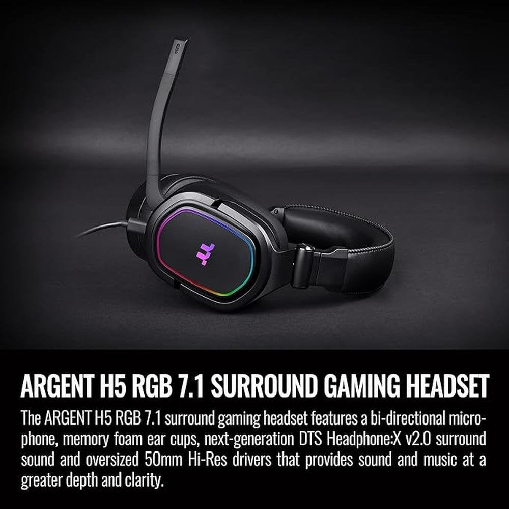 The ARGENT H5 RGB 7.1 surround gaming headset boasts a bi-directional microphone, plush memory foam ear cups, next-generation DTS HeadphoneX v2.0 surround sound, and oversized 50mm Hi-Res drivers that provide sound and music at a greater depth and clarity. Users can enjoy this headset while playing on PC, Xbox One, PS4, Mac, Mobile, and Nintendo Switch, making it an ultimate gaming accessory.