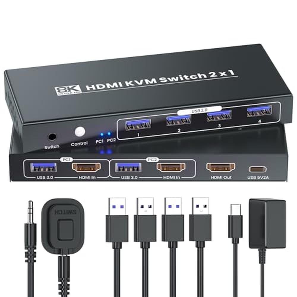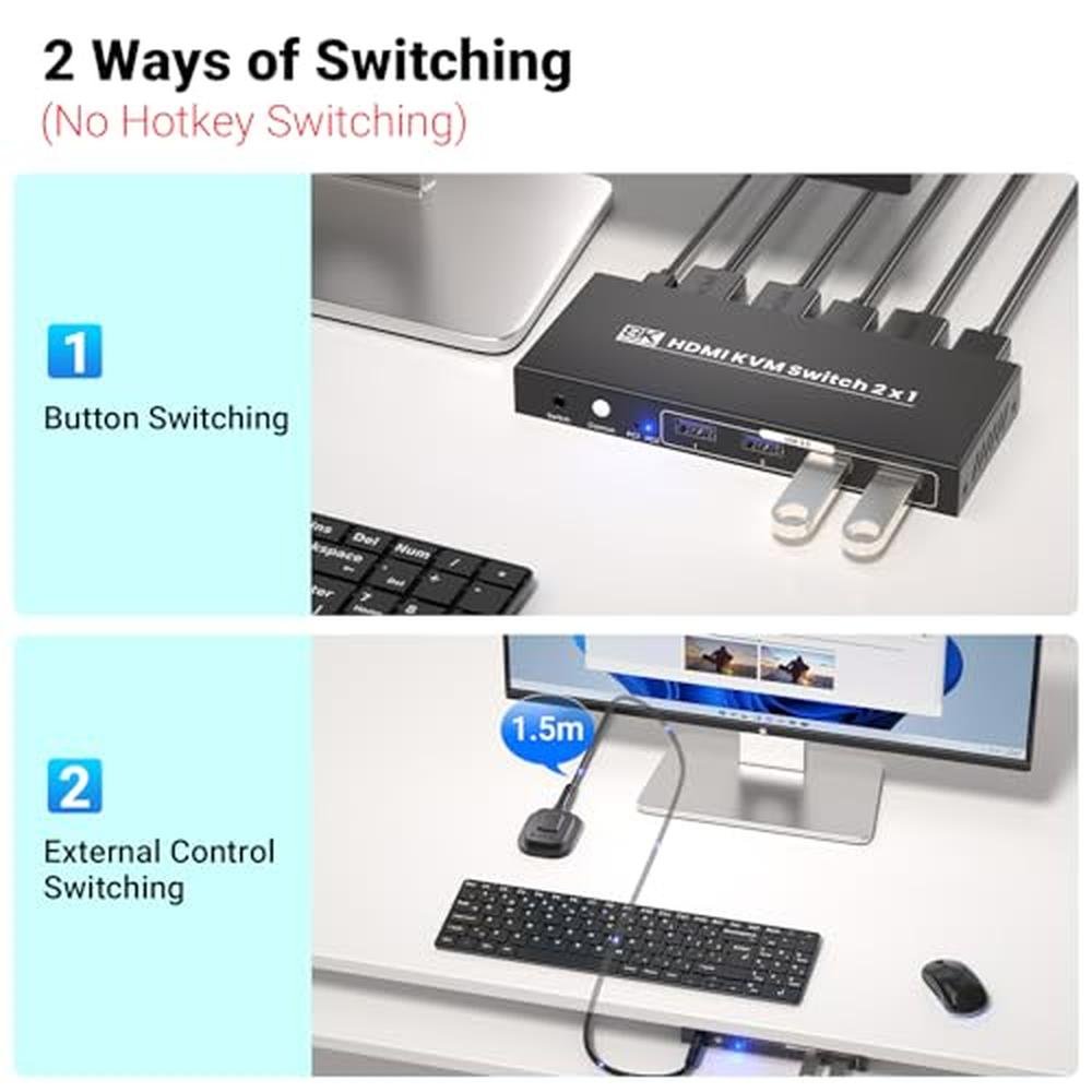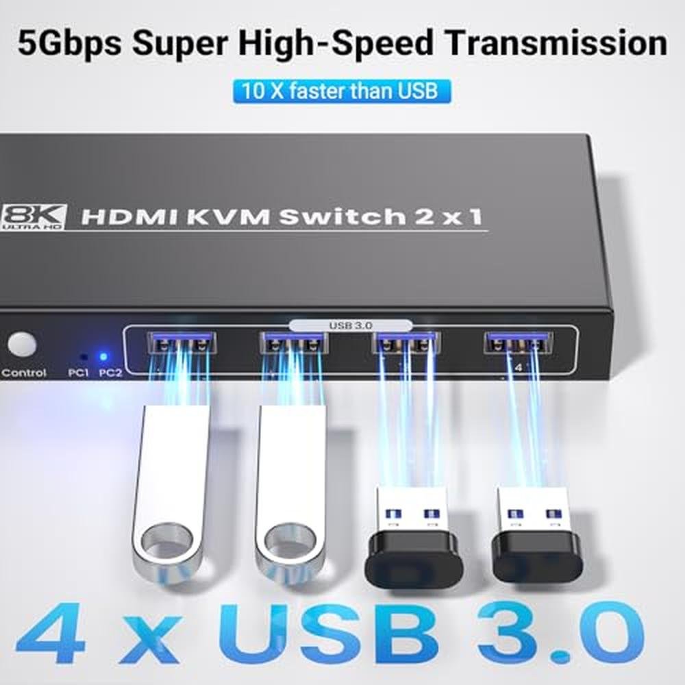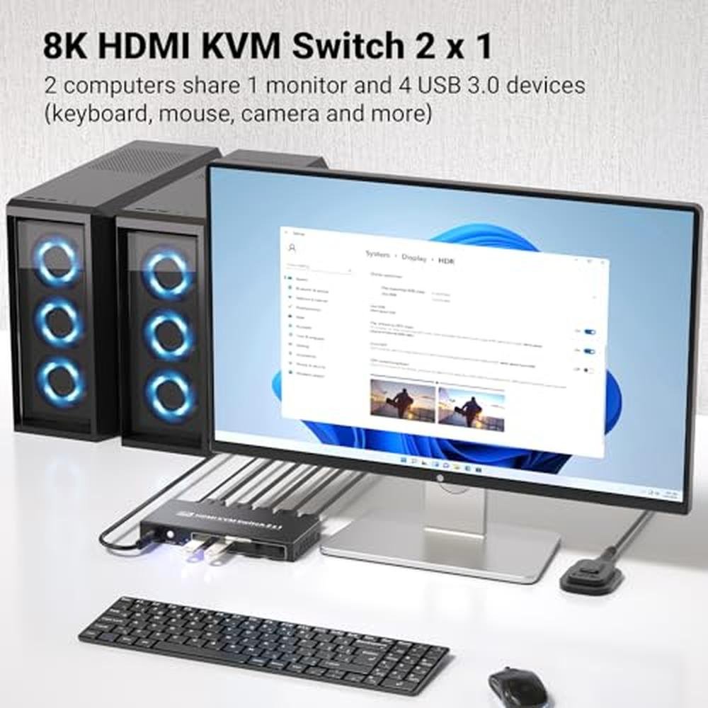 HDMI KVM Switch 1 Monitor 2 Computers, 8K60Hz 4K120Hz USB 3.0 2 Port HDMI KVM Switch for 2 PC Management Via 1 Set of Keyboard Mouse and 1 Monitor