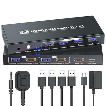8K@60Hz 4K@120Hz HDMI KVM Switch 1 Monitor 2 Computers Simplify your workspace without compromising on performance with our 8K HDMI KVM Switches This 8K 2 port HDMI KVM Switch is designed to seamlessly connect one monitor to two computers. It allows user to control and manage 2 computers via 1 set of keyboard, mouse and 1 monitor. Ideal solution for professionals and enthusiasts who require high - resolution visuals and efficient multi - computer setups. Specifications 1. Resolution Support: Up to 8K (7680 x 4320) 2. HDMI Ports: 2 x HDMI input ports for two computers, 1 x HDMI output port for one monitor 3. USB Ports: USB 3.0 ports for data transfer and peripheral sharing 4. Switching Modes: Front-panel Switching or external controller switching 5. Compatibility: Compatible with Windows, m-a-cOS, and Linux operating systems Applications This 8K HDMI KVM Switch 2 computers is ideal for a variety of applications, including: 1. Professional Workspaces: For graphic designers, video editors, and other professionals who require high - resolution visuals and seamless switching between multiple computers. 2. Gaming Enthusiasts: Enjoy high - definition gaming on a single monitor while easily switching between different gaming systems. 3. Home and Office Use: Simplify your setup by connecting multiple computers to a single monitor, ideal for multitasking and efficient workflow. Package List: 1. 8K HDMI KVM Switcher 2. User Manual 3. External Controller(1.5 meters) 4. USB 3.0 Cables(2pcs, 1.2 meters)
