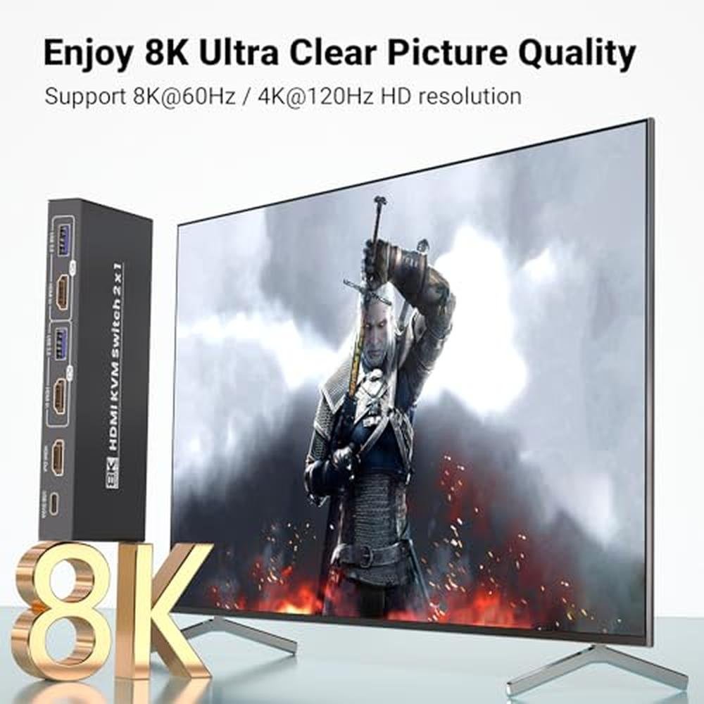 - 8K60Hz 4K120Hz Resolution SupportExperience unparalleled clarity and detail with full 8K resolution support. This 2 port HDMI KVM switch ensures that your monitor displays crisp, vibrant visuals, making it ideal for tasks such as video editing, graphic design, and high - definition gaming. Note: to ensure 8K resolution, your computer, monitor, and HDMI cables must all support 8K resolution.