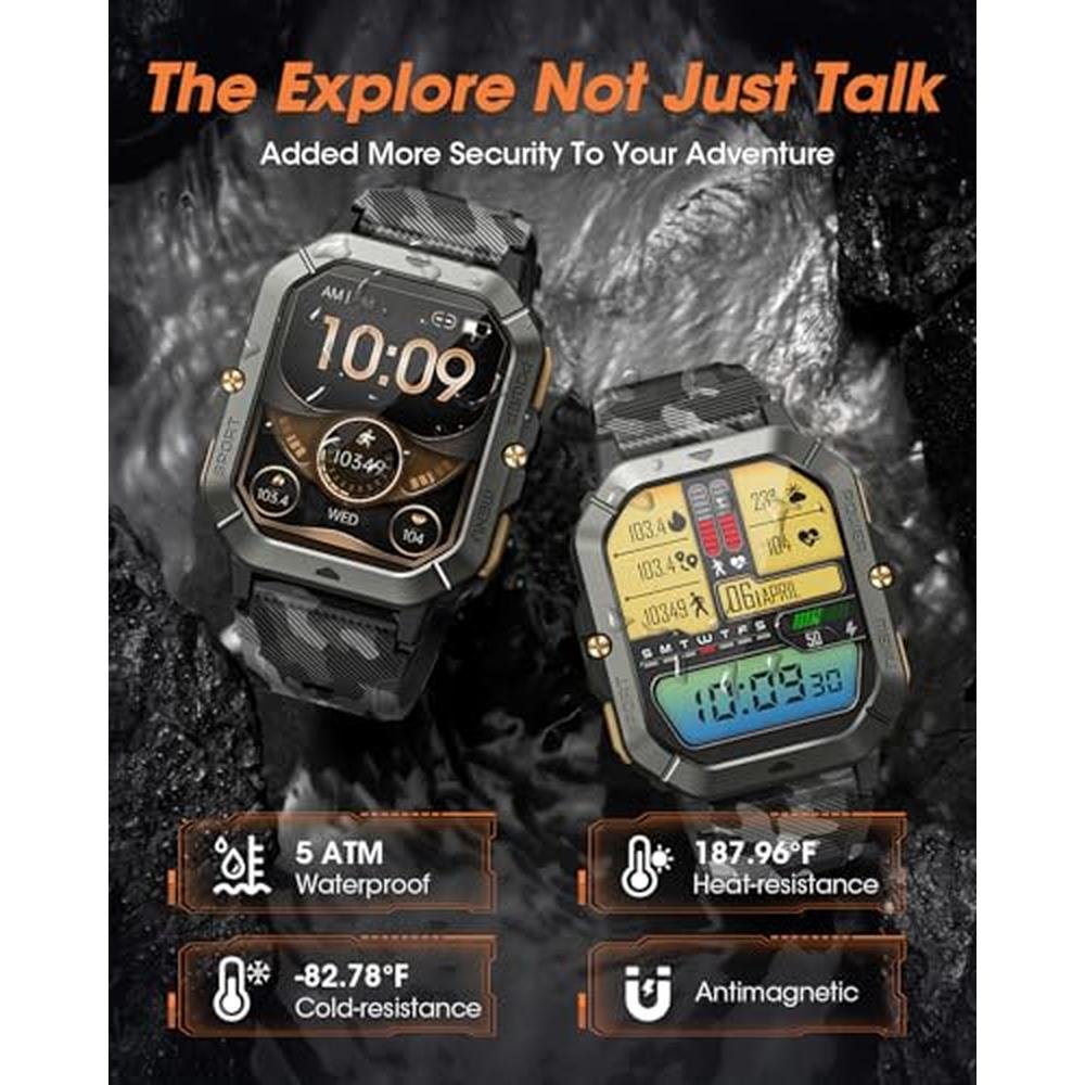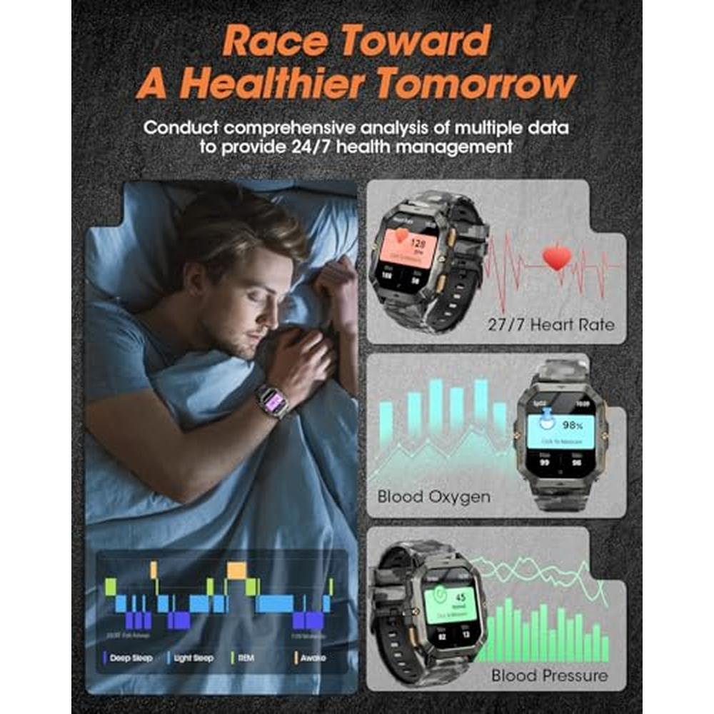Our military smart watches for men boast an array of impressive features, including a 2.02'' HD touch screen, 5 ATM water resistance, and a high-precision optical sensor for accurate health monitoring. With 100+ sports modes to choose from, you can tailor your fitness routine to suit your unique needs and preferences. Additionally, our smart watches offer incoming call notifications, support for making and connecting calls, SMS and SNS message notifications, camera control, music control, and sedentary reminders, ensuring you stay connected and on top of your daily activities.