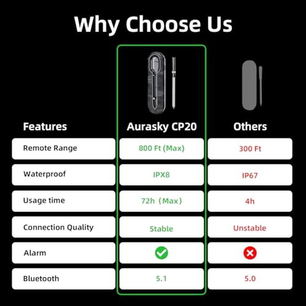 - 100% Wireless & Stable ConnectionAurasky wireless Bluetooth meat thermometer ensures a fast and stable link between the probe and the app. The probe connects to the repeater within 300 ft, the repeater to the app within 500 ft, and up to 800 ft in open areas for a reliable connection anytime