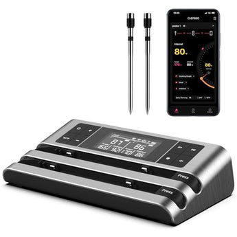 This wireless smart meat thermometer offers unmatched convenience for grilling enthusiasts. Its wireless technology allows you to place the probe inside an oven or smoker without worrying about cables. The dual-sensor probe accurately measures both the food's internal temperature and the ambient temperature, ensuring every aspect of the cooking process is under control. With the dedicated app, you can remotely monitor temperature changes from up to 500FT away, and its real-time sync with the main unit simplifies operation. The large display and intuitive buttons on the main unit make it easy to set temperatures, timers, and alarms. Additionally, the thermometers impressive battery life allows the main unit to run for 120 hours after just 2 hours of charging, while the probe can work for 10 hours on a 30-minute charge, or up to 24 hours for low-temperature smoking. Whether you're a novice or a seasoned pro, this thermometer will help you effortlessly create perfectly cooked meat every time.