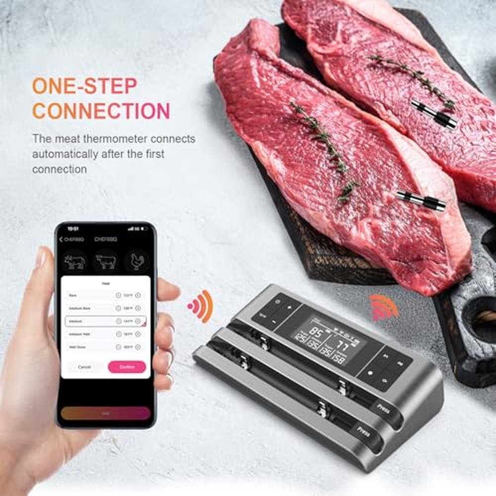 - 500FT Long-Distance Signal Transmission: The dedicated app connects wirelessly to the main unit, which acts as a signal relay between the probe and the app. This ensures a transmission range of up to 500FT, so you can monitor your cooking progress from the kitchen or backyard.