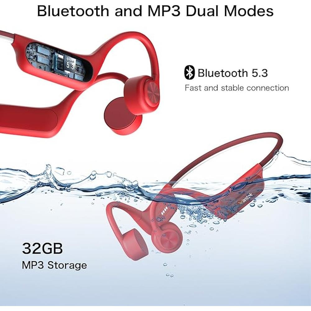 Wantek Bone Conduction Headphones with Mic, Open Ear Bluetooth & MP3 (32GB), IP68 Waterproof for Swimming Running Workout, Secure Fit, 2025 Updated, Red