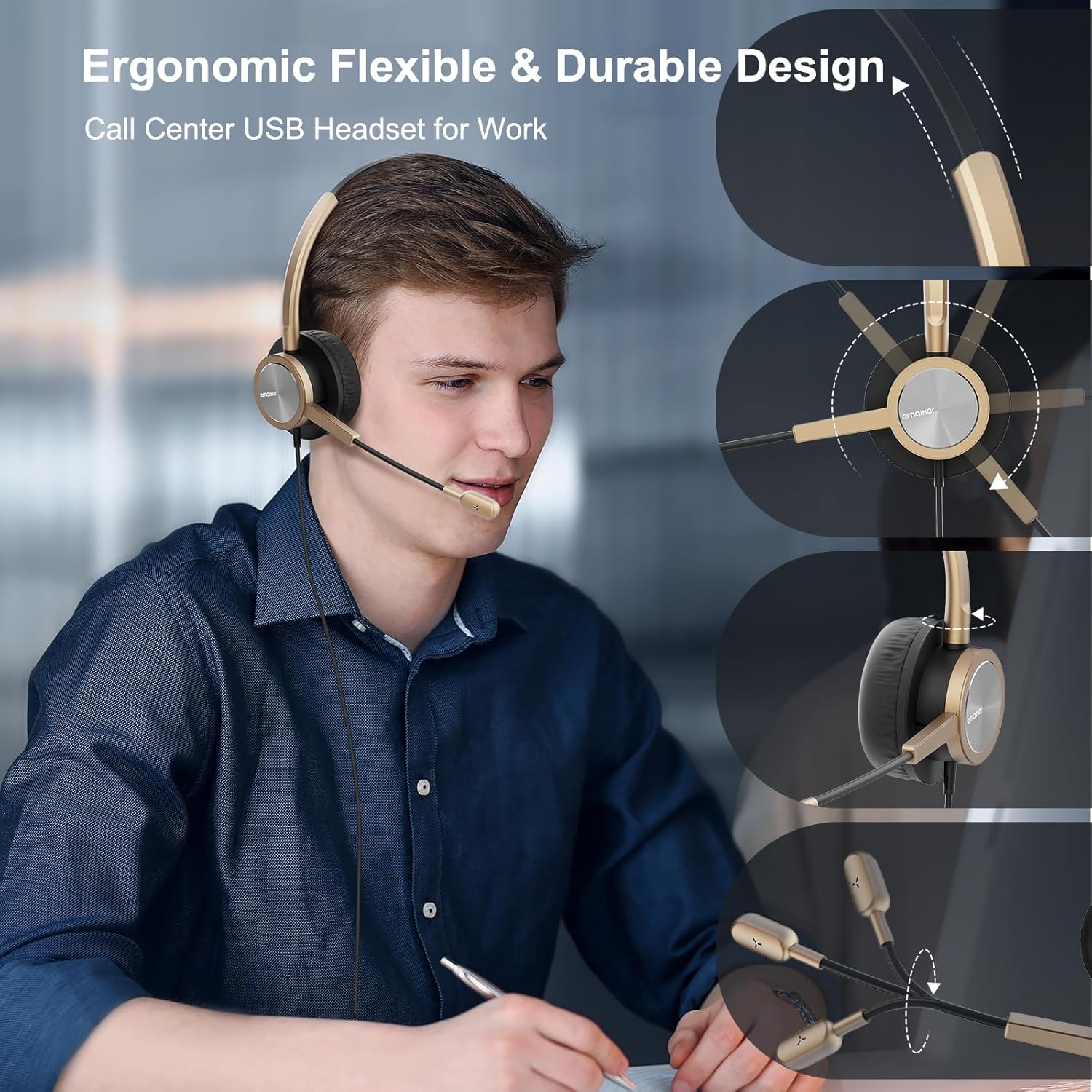- Perfect audio quality and stylish design: Professional usb headset for calls, meeting is specially designed for clear communication on computer calls,skype chat,e-learning or zoom meeting conference calls etc. With hi-fi stereo speaker headphone delivers crystal clear sound, the noise cancelling microphone blocks out unwanted background noise and pick up loud and clear sound. The stylish structure and gold color of this UC communication headset shows your flamboyant personality and unique charm.