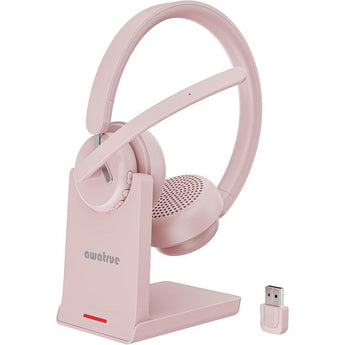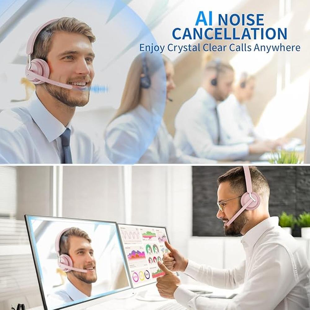 Immerse yourself in crystal-clear audio and seamless connectivity with our Wireless Headset with Mic, expertly designed for remote work, call centers, and video conferencing on platforms like Zoom. Equipped with advanced AI noise cancelling technology, this premium Bluetooth headset ensures that your voice is heard loud and clear, while eliminating background noise and distractions. The included charging base and USB dongle provide effortless connectivity to your computer, allowing you to work efficiently and focus on what matters. With its sleek pink design and 2.4GHz wireless headphones, this headset is the perfect solution for professionals seeking a reliable and high-quality audio experience. Whether you're working from home, in a call center, or participating in online meetings, our Wireless Headset with Mic is the ideal choice for premium audio and unparalleled convenience.