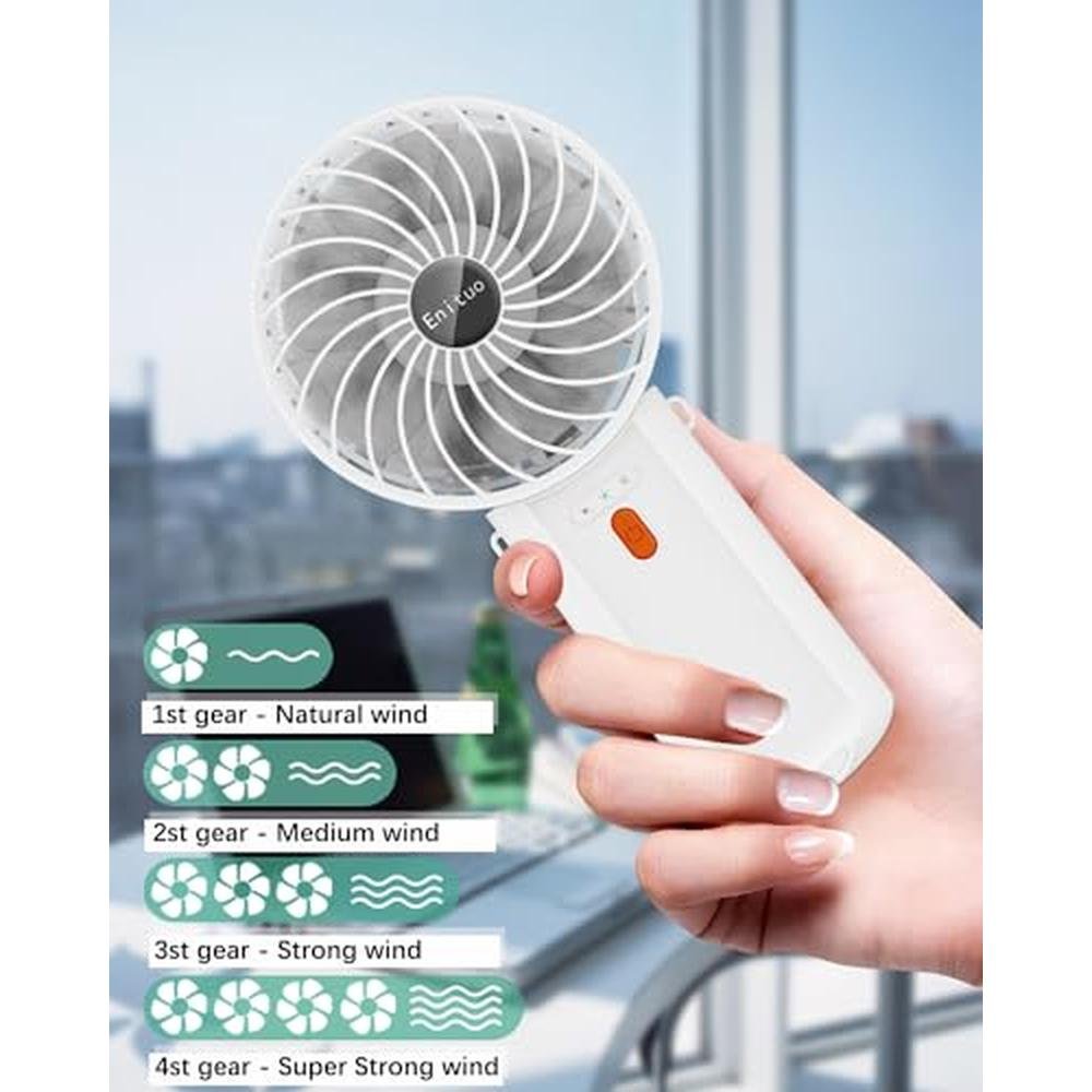- Powerful Wind 4 Speeds Adjustable our portable handheld fan is built with a new copper motor, which is powerful enough that can support the blade running at very high speed to produce strong wind, the fluid-mechanical designed cover can strength the wind brought out by the blade. 4 adjustable wind speeds allow you to control the airflow from natural, slow, medium and fast according to different needs