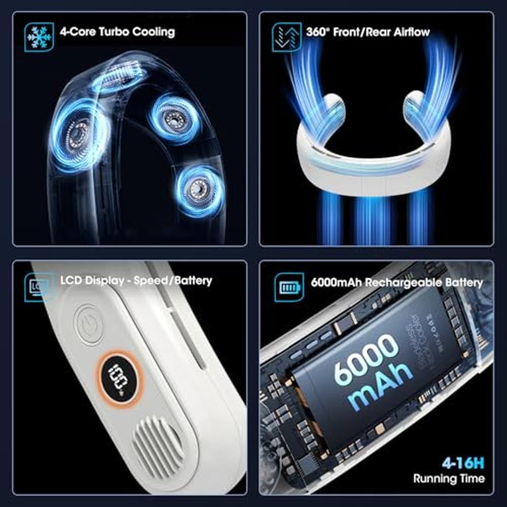 - Brand New Portable Neck Fan Rechargeable - OLV Latest version portable neck fan upgraded the airflow and noise reduction function.The wearable neck fan got more powerful airflow and low-noise which keeps your cooling always.With 6000mAh bartteries and four turbos motor design,it will last longer and provide high-velocity wind.Safer than those before and don t worry about your hair being caught or dust,sweat enter the neck fan.Ideal choice as a companion for working in the hot summer.