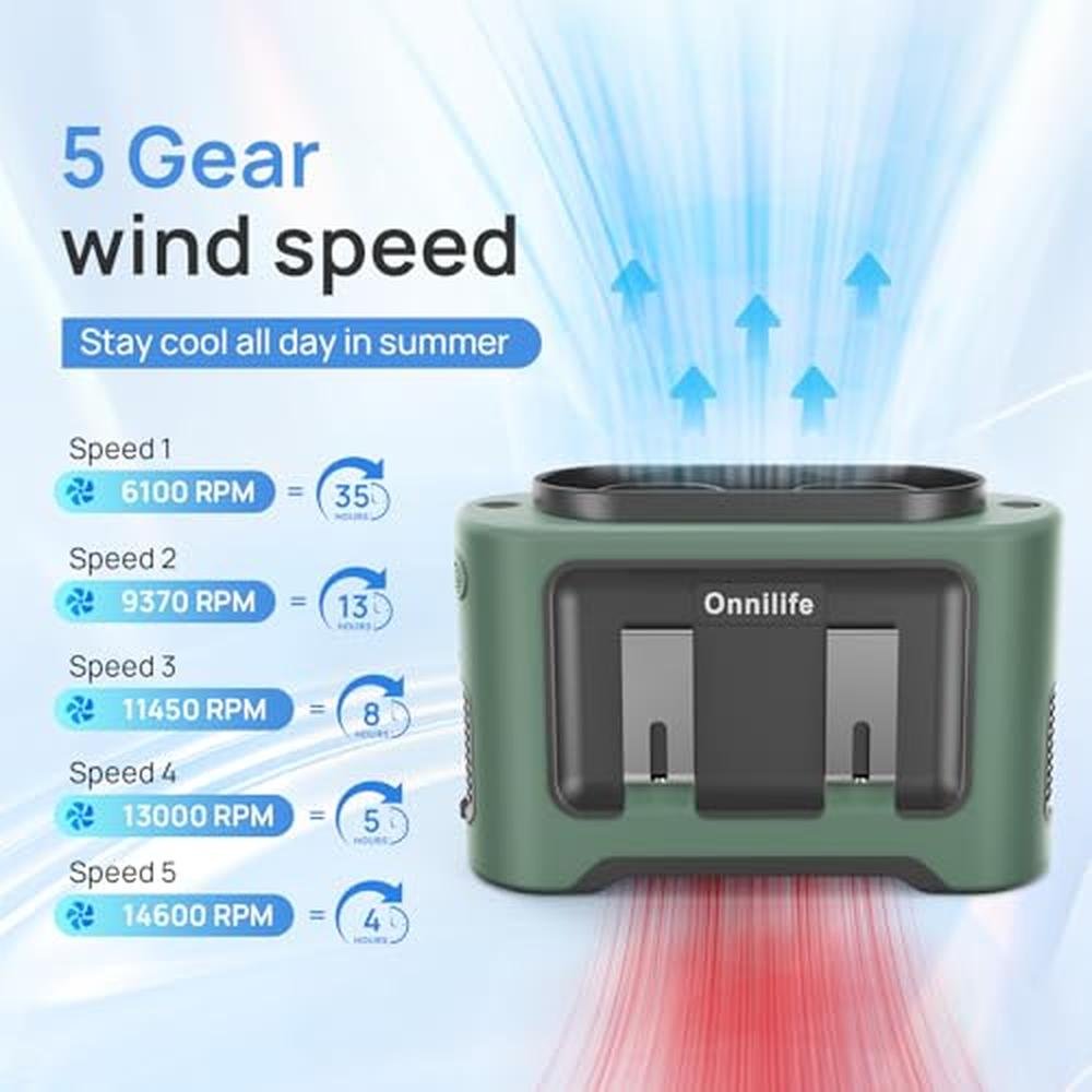 Onnilife 14500mAh Portable Waist Fan Rechargeable, Wearable Belt Personal Fan, Hands Free Hanging Neck Fan with Flashlight and 5 Speeds 14600RPM Strong Airflow for Camping, Outdoor, Jobsite (Green)