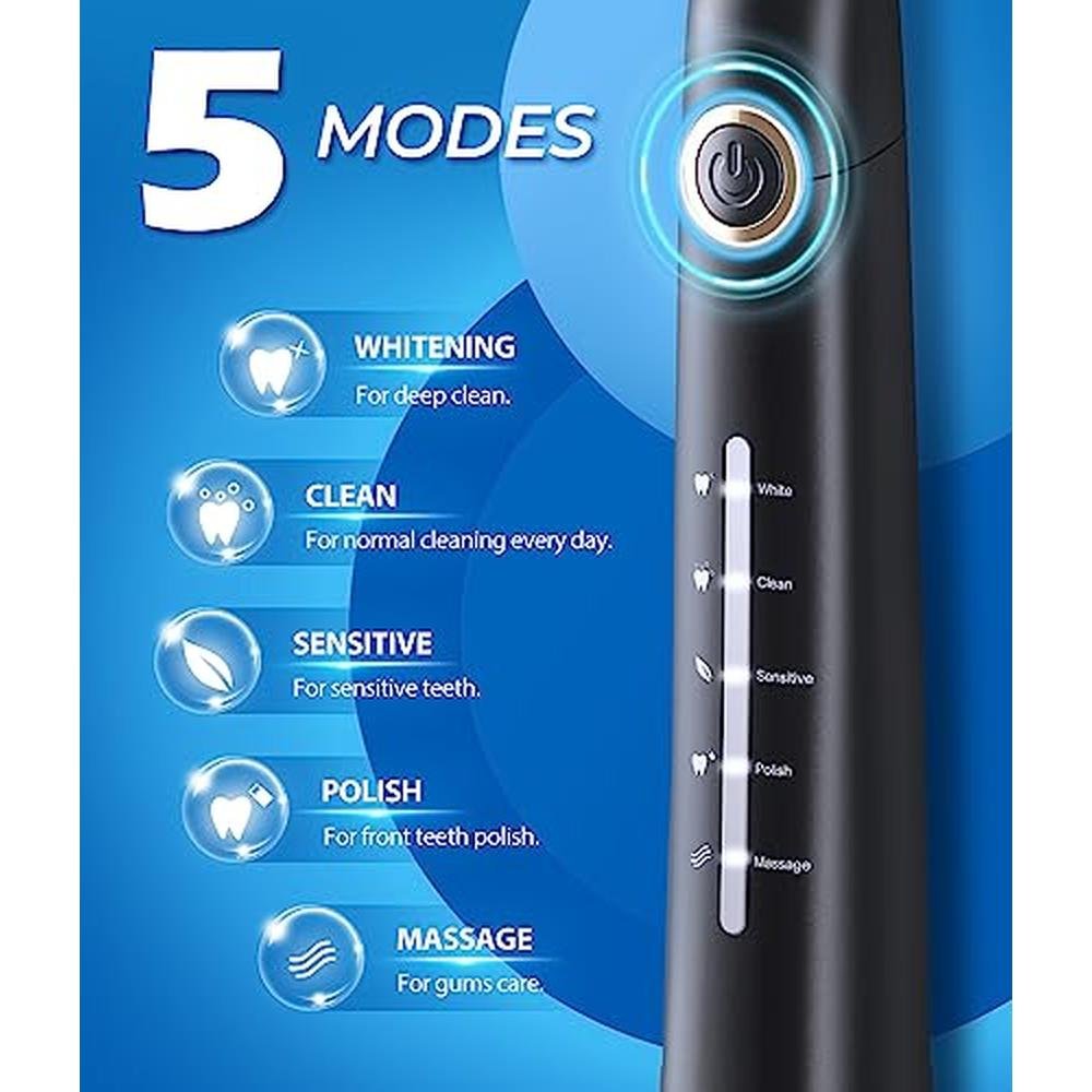 SKU | BM5 High-performance Modes - electric toothbrush for adults supports 5 modes based on your specific needs: whitening, cleaning, sensitive, polishing, massage. Whitening mode vibrates 40,000 strokes per minute to break the stains. Clean mode goes deep into the inter dental, removes the dirt hidden in the periodontal. While Massage mode offers a gentle massage of gums to stimulate blood flow and strengthen and nurture the gum health. Whiter teeth and healthier gums mean a more beautiful smile. |