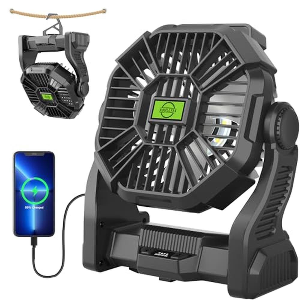 - 270 Head Rotation Hanging Hook Design - The outlet angle of the cordless fan camping fan can be manually rotated 270 , allowing you to get a quiet and strong airflow from different directions to meet your angle adjustment needs. In addition, the camping fan for tents features a 360 rotating hook design that can be easily hung on top of the tent to save space.