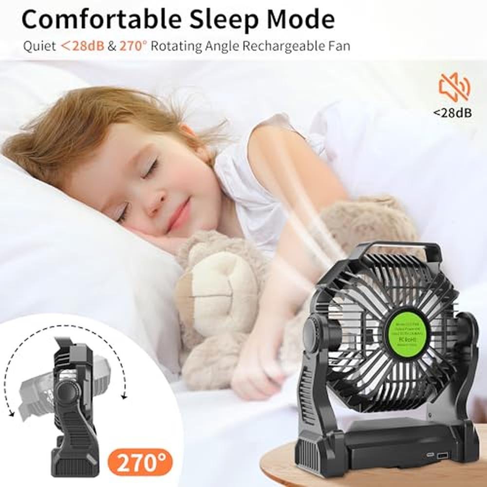- Low Noise But Powerful Wind - The battery powered fan for camping fan uses the latest brushless motor technology and high-performance ultra-thin fan blades, providing super strong airflow with efficient operation and the lowest noise 28 dB. The camping fan has 4 wind speeds options to ensure air circulation in the tent, you can also have a peaceful experience, such as working, resting and reading.