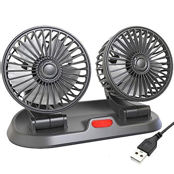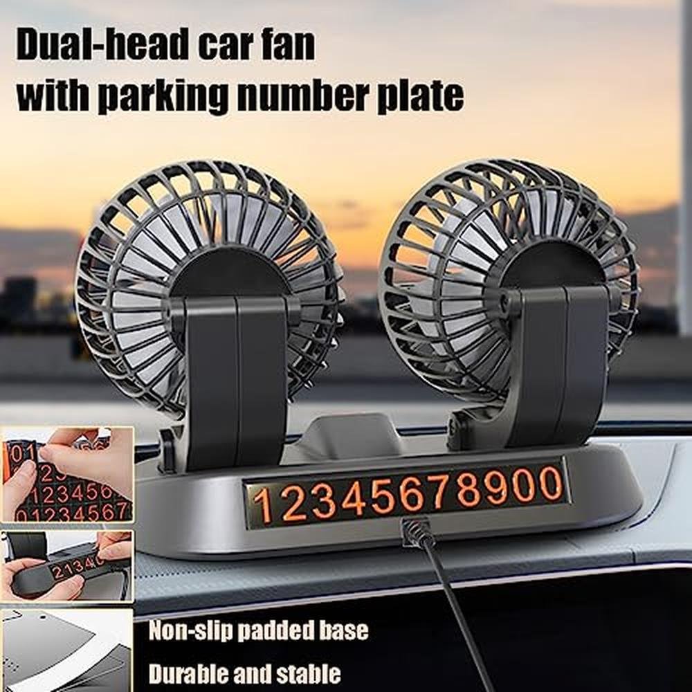 - 360 Adjustable Car Fan Dual-head car fan can rotate 180 horizontally and 360 vertically, adjustable in any direction. Our car cooling fan is attached with 3 strong adhesive stickers and number sticker. The fan can be fixed to the dashboard and the number can be attached to the back for ease of use.