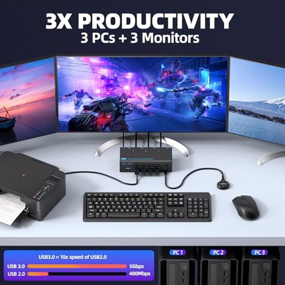 • 3 PCs Share 3 monitors DP and HDMI USB 3.0 KVM switch enables 3 computers to share 3 monitors with 4 USB 3.0 devices(including keyboards, mouse, printer, camera ). It keeps your workspace organized and efficient, a premium choice for office work setups.