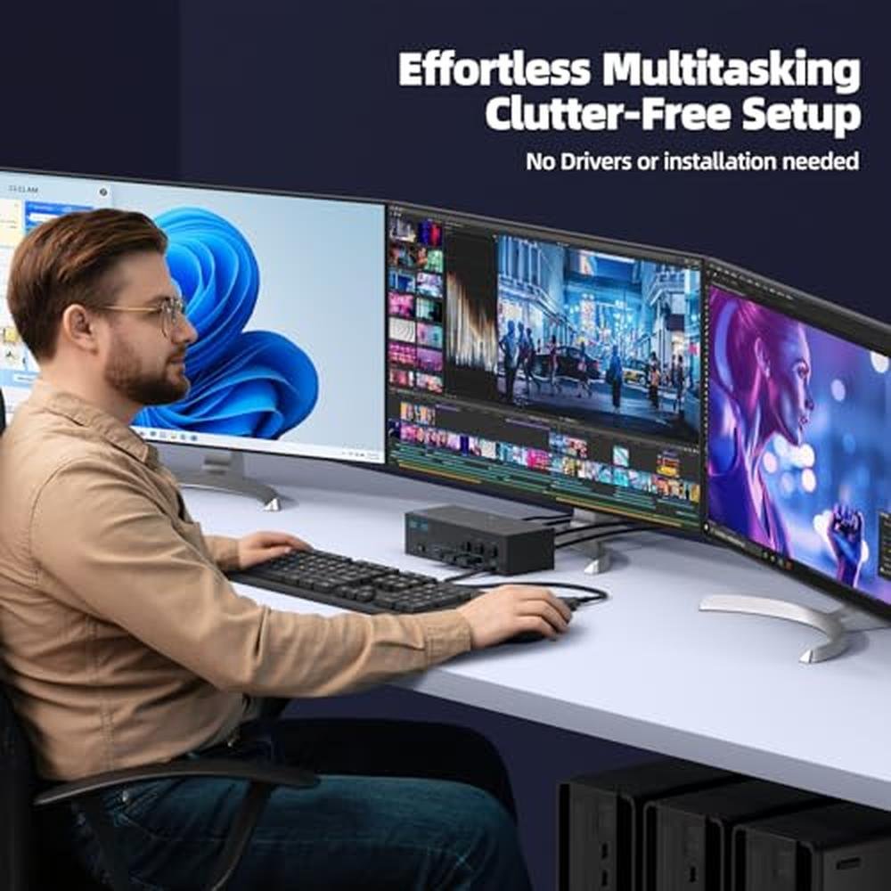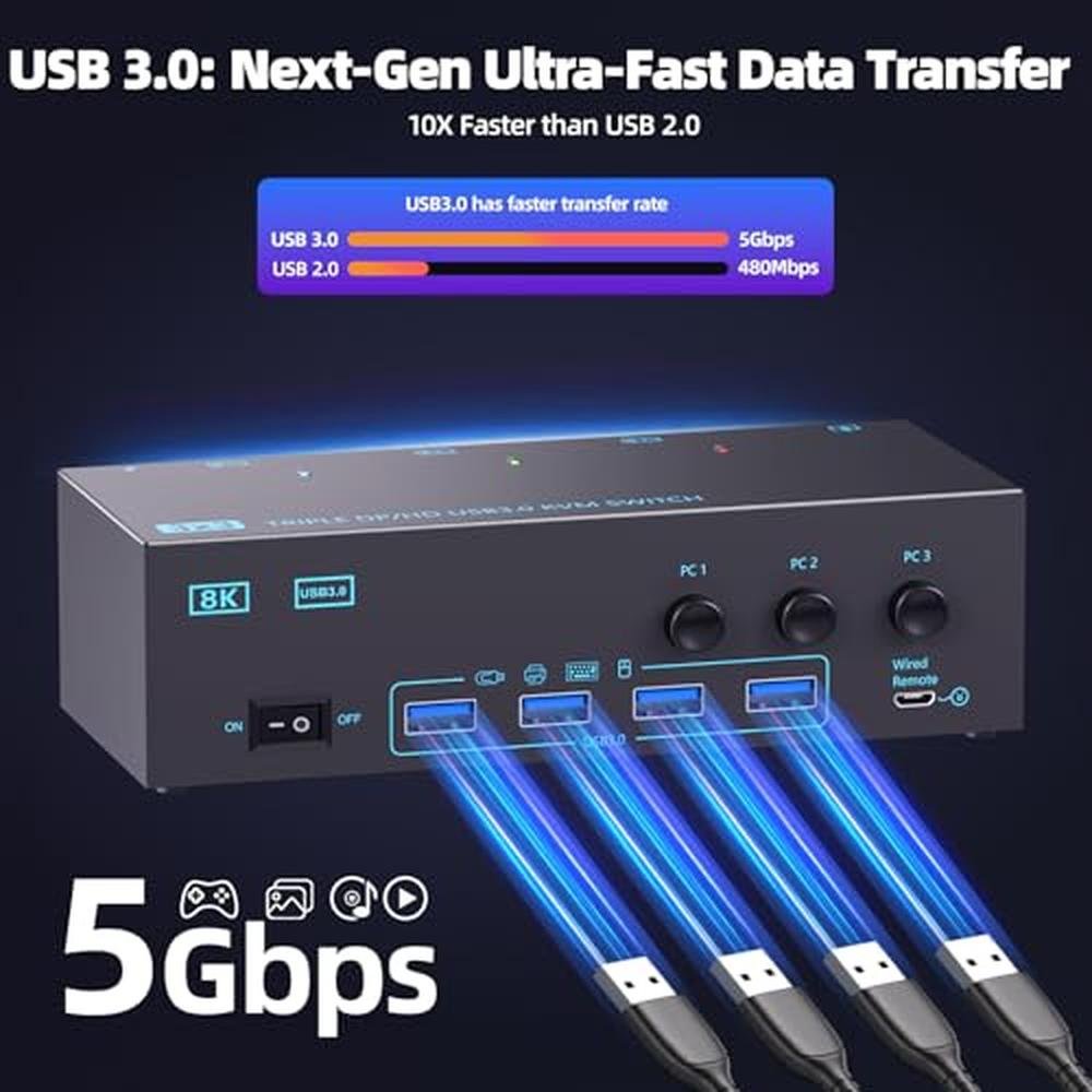 • Support High Resolution and HighRefresh Rate Triple monitor KVM switch supports up to 8K@60Hz/30H, 4K@144Hz/120Hz (HDMI port supports 8K@60Hz/4K@120Hz, DP port supports 8K@30Hz/4K@120Hz). Warning: Use HDMI2.1 and DP1.4 cables for a better experience, shorter cables are better when distance allow.