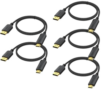 Indulge in exceptional video and audio quality with our premium 4K DisplayPort to HDMI Cable 5-Pack, featuring a male DisplayPort to male HDMI connector. This 6-foot braided cord is designed to provide a reliable and high-definition connection between your device and display, supporting resolutions up to 4K (2160P), 1440P, and 1080P. Our male DisplayPort to HDMI adapter cord is perfect for connecting your laptop, computer, or other device with a male DisplayPort to an HDMI-enabled TV, monitor, or projector. With its durable construction and gold-plated connectors, this cable ensures a stable and interference-free signal transmission. Please note that this cable is not bidirectional, meaning it can only transmit signals from a DisplayPort source to an HDMI display. Elevate your viewing experience with our top-tier, high-performance cable, expertly crafted to deliver superior video and audio quality. Immerse yourself in stunning visuals and crystal-clear audio, perfect for gaming, entertainment, and professional applications. Experience the ultimate in connectivity with our premium 4K DisplayPort to HDMI Cable.