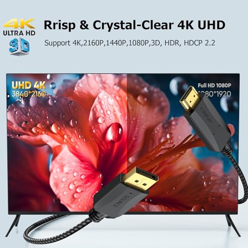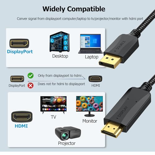 • Not bidirectional, can only transmit signals from a DisplayPort source to an HDMI display, with a 6-foot braided cord for reliable connectivity