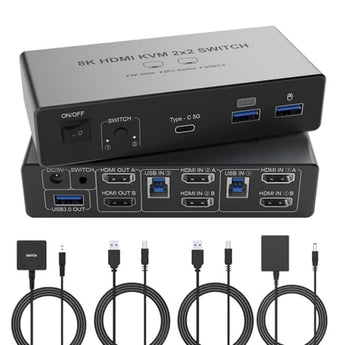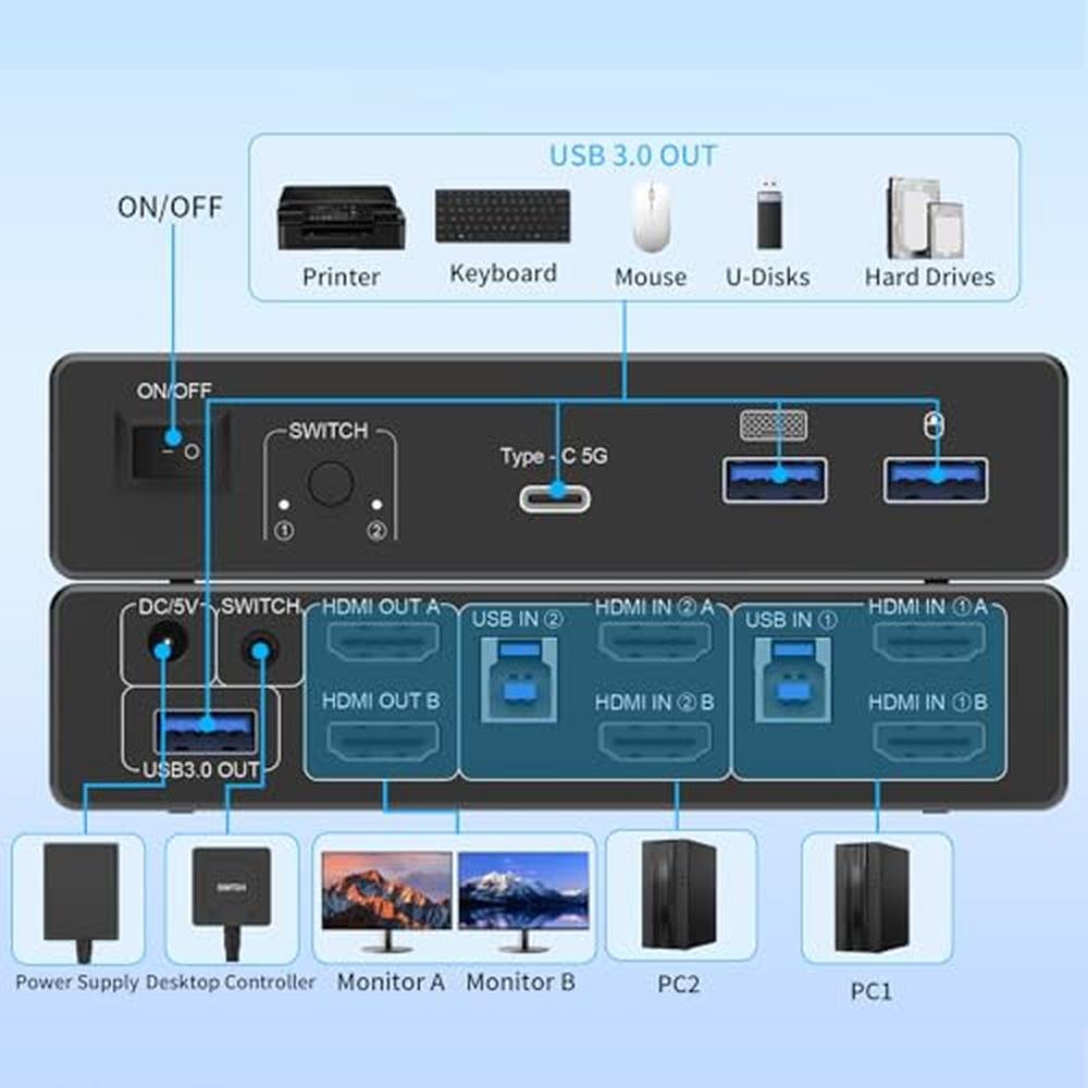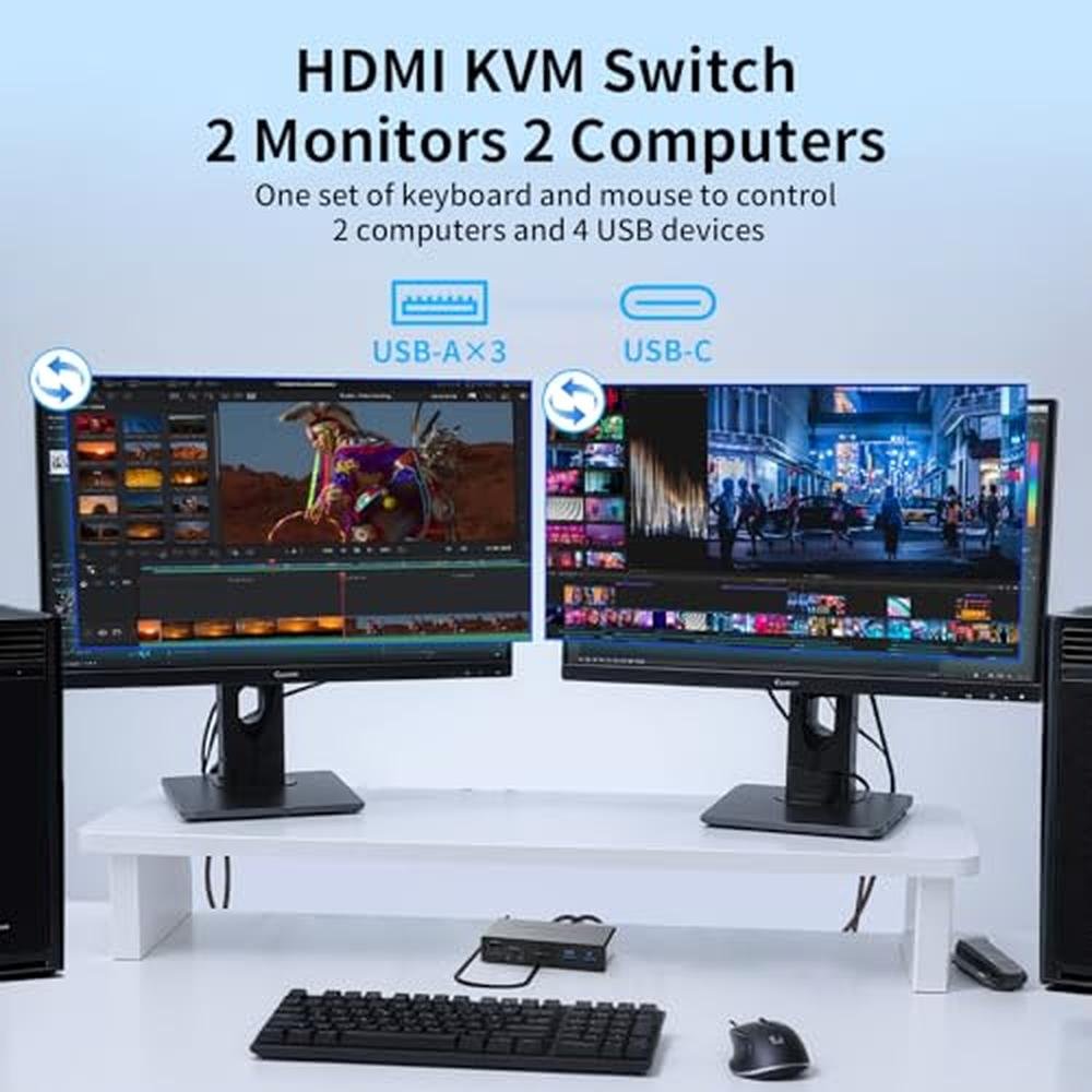 HDMI KVM Switch 2 Monitors 2 Computers 8K@60Hz, with 4 USB 3.0 Ports for 2 Computers Sharing 2 Monitors Keyboard Mouse Printer with 2 USB Cables, Power Adapter and Controller
