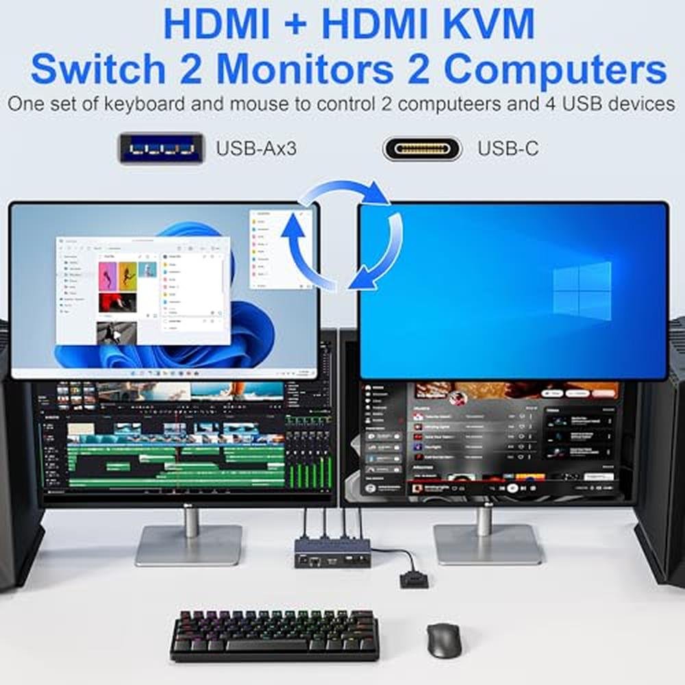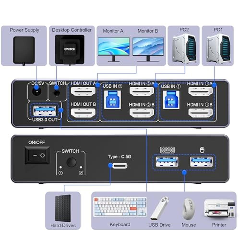 8K@60Hz HDMI KVM Switch 2 Monitors 2 Computers with 4 USB 3.0 ports (3 USB-A+1 USB-C)2 port HDMI KVM Perfects for hooking up 2 desktops or laptops to share 2 monitors and 1 set of keyboard, mouse for home office setup, gaming consoles and streaming devices. Only when your computer supports dual display, you can use this KVM to achieve two computers to share two monitors, extended mode or copy mode. (NOTE: This is HDMI KVM switch, not DisplayPort KVM switch.)8K@60Hz Resolution: Experience the future of visual technology with our 8K@60Hz KVM Switch, delivering crystal-clear resolution for the most immersive viewing experience. Stay ahead of the curve and enjoy stunning visuals like never before, ensuring every detail is captured with utmost clarity. And if you need different resolutions, fear not, it also supports 8K@30Hz, 4K@120Hz, 3D and 1080P as well.With 4 USB 3.0 Ports: This Dual Monitor HDMI KVM switch has 4 USB 3.0 ports (3 USB-A+1 USB-C) for sharing mouse, keyboard, USB flash drives, printer, and other USB devices. USB 3.0 offers data transfer speeds of up to 5Gbps, which allows faster data transfer to make work more efficient. (NOTE: To ensure USB devices normal usage, please make sure to connect the power supply via the power adapter)Seamlessly Compatible & Extended and Copy Mode: HDMI KVM Switch driver-free for Windows, Mac OS, Linux, and Chrome OS. Plug and play. Dual monitor KVM switch support extended and copy display modes. Copy mode: The main screen can be copied to the second output screen to display two identical screens. Extended mode: windows on the main screen can be dragged to the second output screen to display two different screens. NOTE: Please make sure your computer supports multi-screen display.Two Switching Modes: It supports button switching and desktop controller switching, freely switch between 2 computers. With the desktop controller, you can place this monitor switch for 2 computers outside your work area, making your desktop cleaner and tidier. NOTE: 1, Please make sure each of your computers can support dual-screen displaying at the same time. 2, Please make sure your computer has 2 HDMI ports+1 USB-A port. 3, Each computer must connect 2 HDMI cables + 1 USB-A cable to ensure working properly. 4, The two monitors can only output the video source from one computer, and cannot output the signal source of PC1 and PC2 at the same time. 5, To ensure normal usage, please make sure to connect the power supply via the power adapter