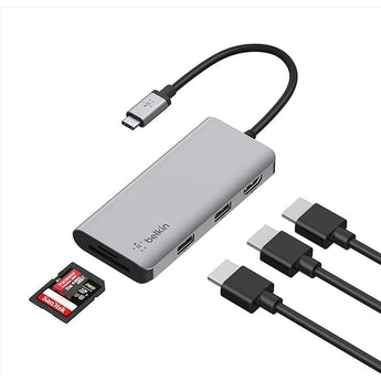Introducing the Belkin 5-in-1 MultiPort Docking Station - the ultimate docking solution for your Mac or Windows laptop. It has 5 powerful ports to connect your MacBook or Windows laptop to multiple peripherals, providing video, data, and power through a single USB-C cable. Get up to 5Gbps data transfer speeds, keeping all of your devices connected together with the speed and power of USB-C. The Belkin 5-in-1 MultiPort Docking Station comes in an innovative compact and slim design with a sturdy aluminum casing, making it ideal for home, office, or travel. Immerse yourself in a smoother and clearer visual experience with up to 4k resolutions at 30Hz. The 5-in-1 MultiPort Docking Station expands the multimedia ports that have been eliminated in the latest Apple and PC laptops and connects to projectors, monitors, SD and MicroSD cards, headphones, microphones, and thumb drives. Power your workstation with the 5-in-1 MultiPort Docking Station. Access all the energy and speed you'll need for work, play, streaming, and more - even while connected to multiple peripherals and devices - all through a single cable connection.