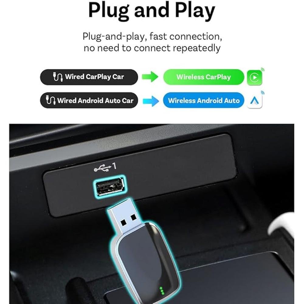 - 2-IN-1 WIRELESS CARPLAY ADAPTER This newly designed wireless CarPlay adapter offers a hassle-free experience by converting wired CarPlay and iPhoneandroid Auto connections to wireless ones. The Bluetooth car adapter is equipped with USB to Type-C cables, which can be used regardless of whether your car interface is USB or Type-C.