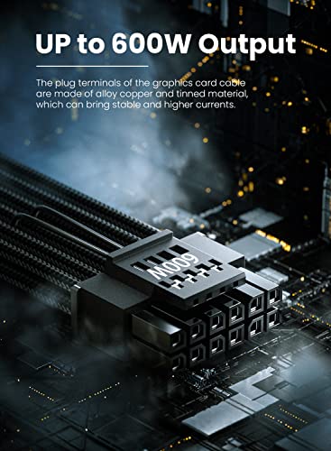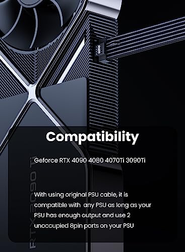 Note: 1. This cable is only suitable for RTX 4090, 4080, 4070ti, 4070, 3090ti. If you are not sure about this compatibility, please feel at ease to contact us. 2. This cable is a sleeved extension cable. And it needs to be worked with the original power cable. 3. We do not recommend DIY adjustment because it may cause pinout deformation and result in poor contact. 4. Don't use PSU 8 Pin to Dual 6+2 Pin PCIE Power Cable as two connecting ports to avoid overload power issue. We do recommend to use 2 pcs PCIE power cables to get a better and more steady performance.