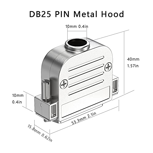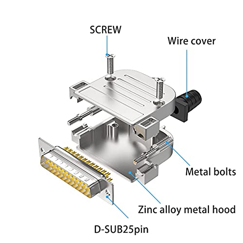 - DB25 metal connector kit includes 2 DB25 hollow PIN Male, 2 metal hood, and 6 Strain Relief Grommet wire cover for a comprehensive solution