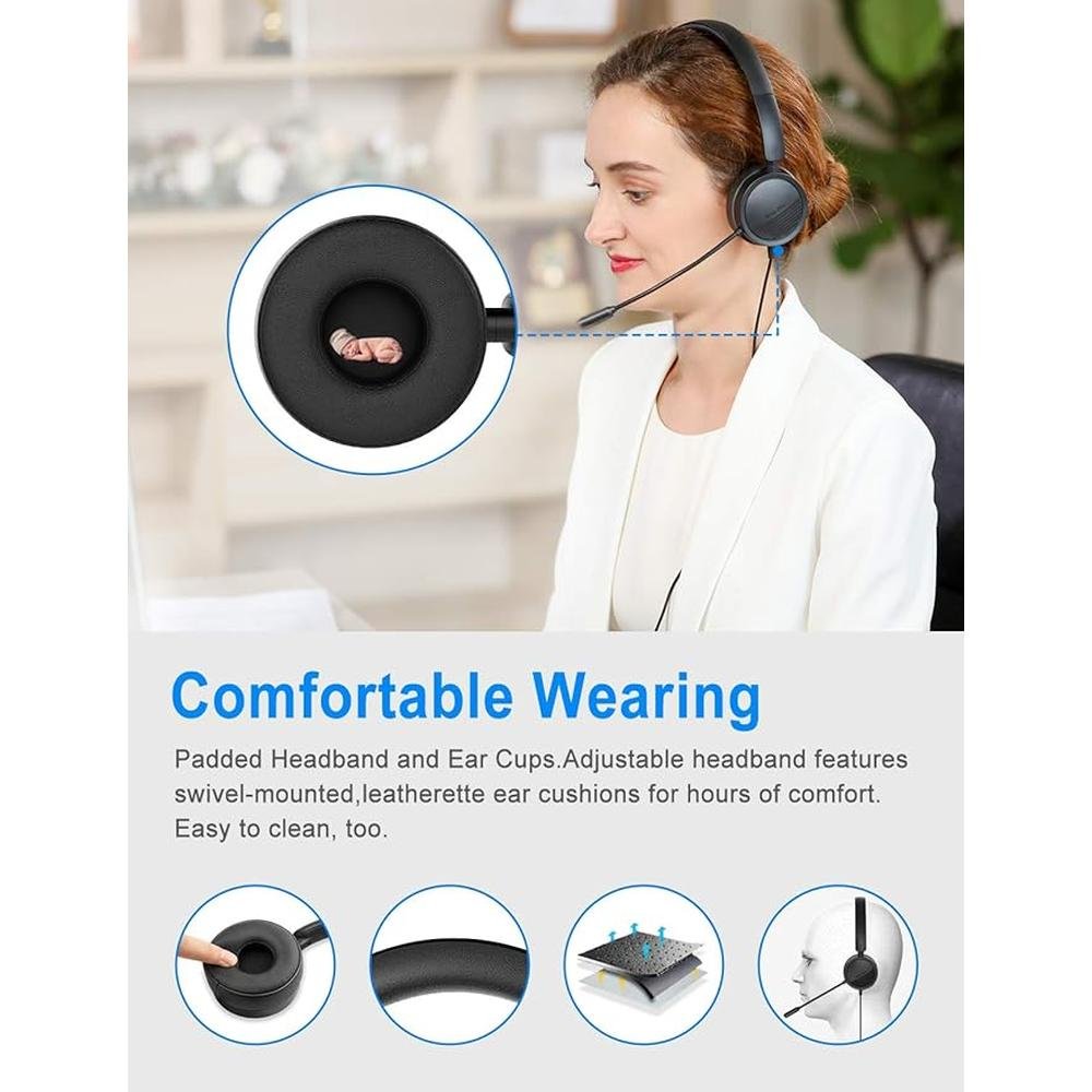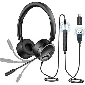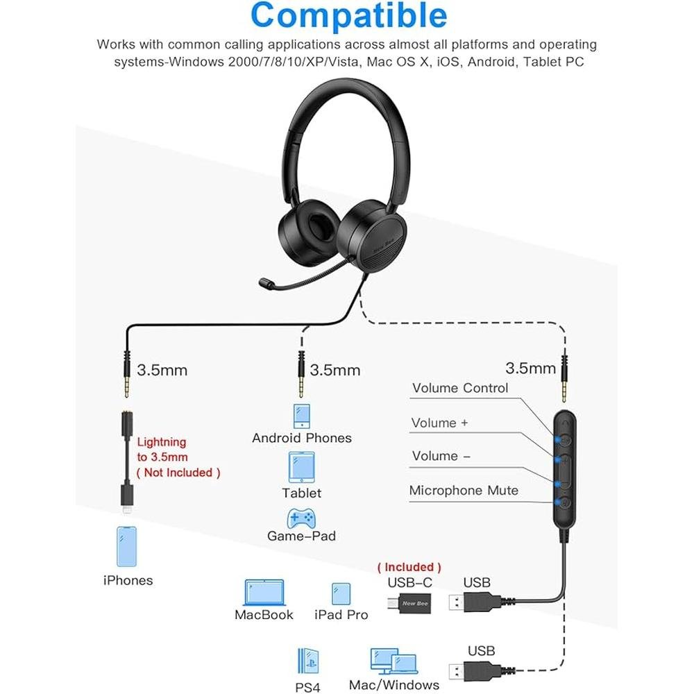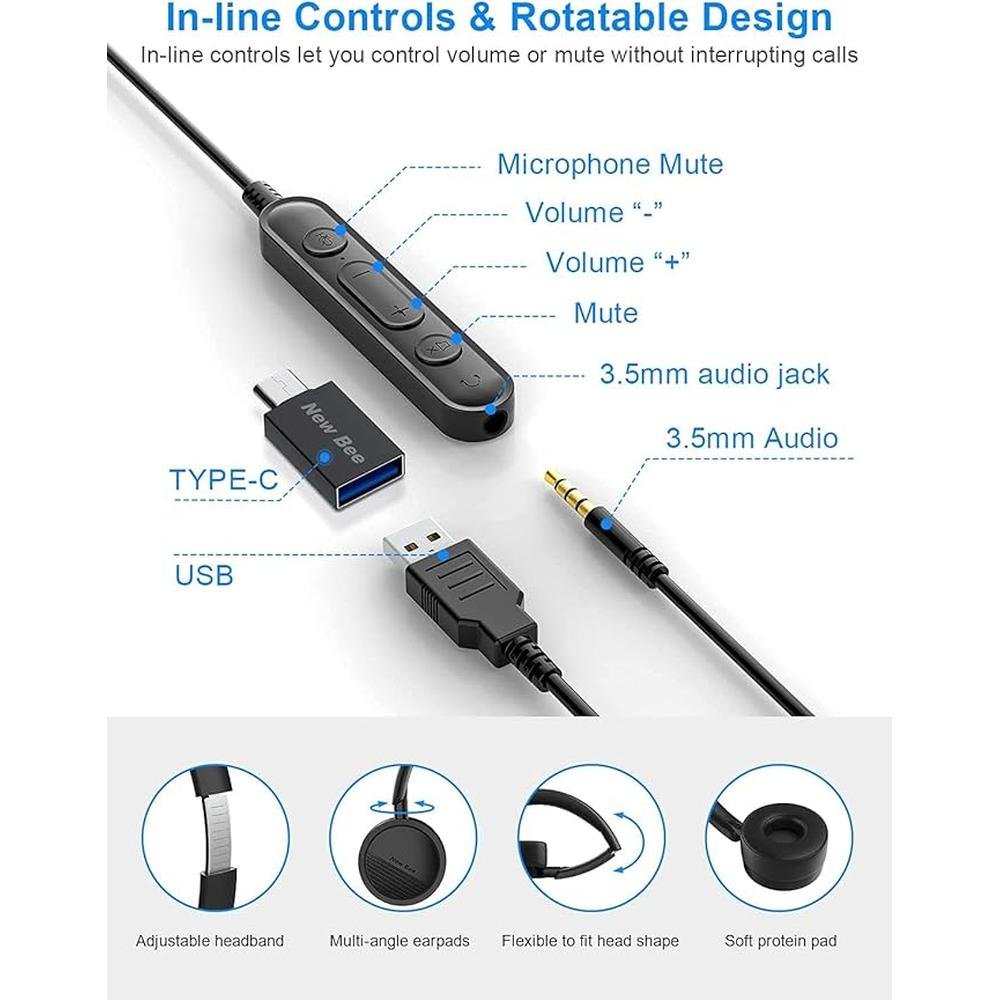 New bee USB Headset with Mic for PC, On-Ear Computer Laptop Headphones with Noise Cancelling Microphone & USB-C Adapter for Home Office Online Class Skype Zoom (Black)
