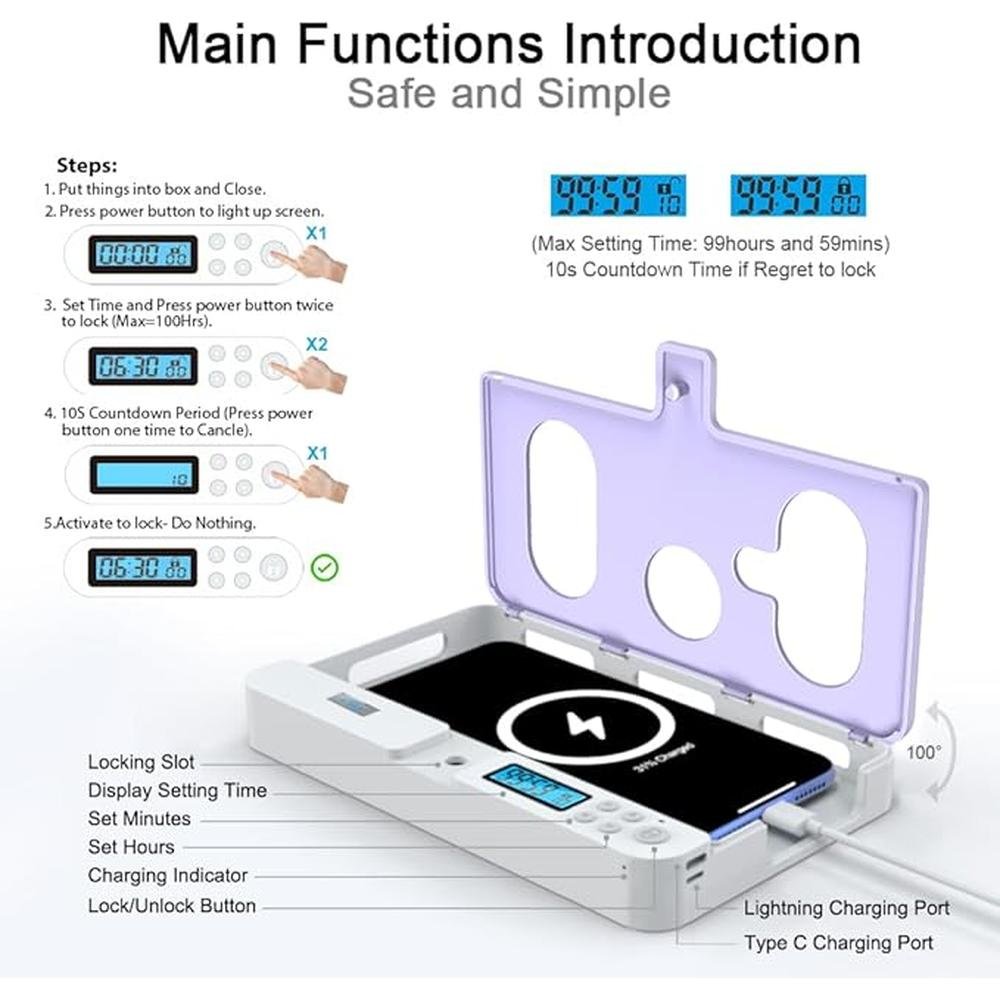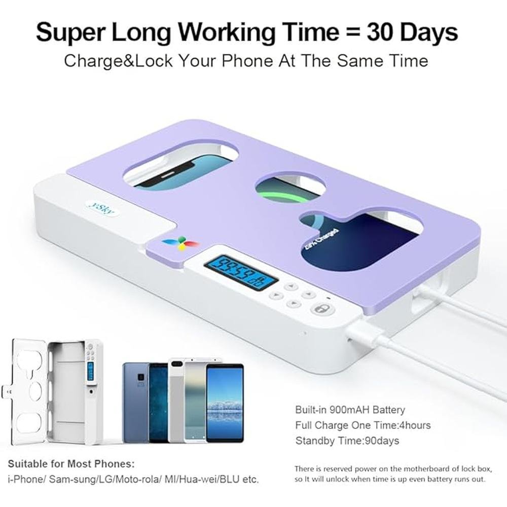 • 30 days long working Time with Auto-Timer Max working Time Reach Up 30Days Once Full Charge. Max setting Time is 99hrs and 59mins ,Super standby time over 90 days.Phone jail box with timer can make you reduce screen time, focus on work, study and life, effectively multiply your time.