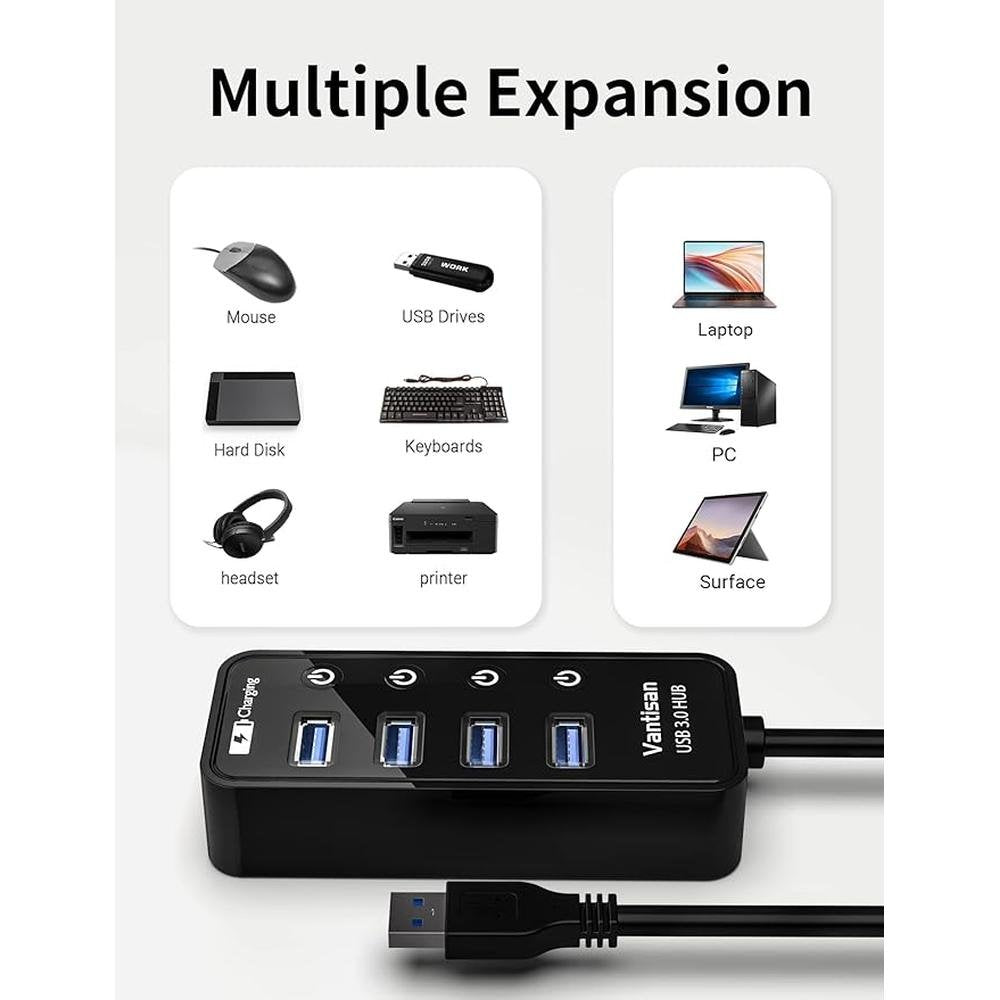 Powered USB 3.0 Hub, USB Extension 4-Port USB Hub Splitter (4 USB 3.0 Data Ports+1 Smart Charging Port) with 5V/3A Powered Adapter and Individual ON/Off Switches