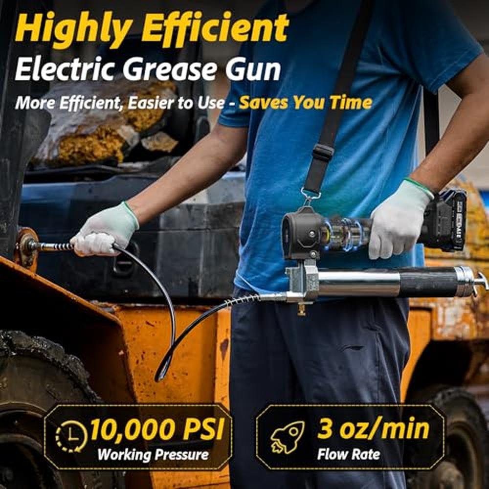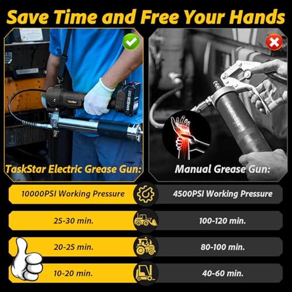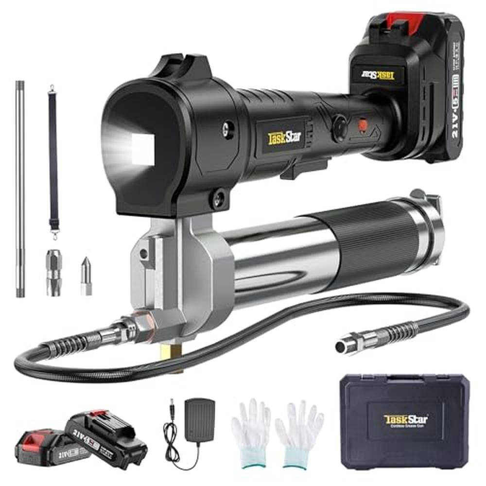 TaskStar Electric Grease Gun Unleashing Powerful Performance and Unmatched Convenience Engineered for efficiency and durability, the TaskStar Electric Grease Gun delivers outstanding performance with up to 10,000 PSI of power. This high-performance tool features an automatic pressurization system and a 3.0 oz/min pump that ensures fast and smooth greasingideal for tackling routine maintenance on a wide range of equipment. Whether you're working on heavy machinery, farm vehicles, or automotive components, TaskStar streamlines your greasing tasks, helping you finish quicker and with less effort. Ease Your Workload Forget the struggle of manual pumping. The TaskStar grease gun significantly reduces muscle fatigue by eliminating the need for constant hand pumping. Its variable speed trigger allows you to precisely control the grease flow, making it perfect for both light and heavy applications. The cordless, one-handed design offers maximum convenience, letting you work freely with less strain, whether you're an equipment operator, mechanic, farmer, or DIY enthusiast. Reliable Power for Seamless Operation With two 21V 2000 mAh batteries, the TaskStar grease gun ensures you can keep working without interruptions. Plus, the TaskStar is fully compatible with Makita batteries, giving you the flexibility to use existing tools without the hassle of additional charging equipment. Designed for Maximum Convenience Working in tight or low-light spaces? The TaskStar grease gun comes equipped with a 39.4 flexible hose that provides easy access to hard-to-reach grease points. The built-in LED light improves visibility in dim conditions, allowing you to work efficiently no matter where your tasks take you. With a compact carrying case, its easy to store and transport your grease gun from one job site to another. Versatile Loading Options for Flexibility The TaskStar grease gun supports both bulk and cartridge loading, offering the versatility to handle a wide variety of greasing tasks. Its 14 oz (400 cc) capacity is perfect for NLGI #2 grease, making it suitable for a variety of applications. The cold-drawn steel tubing, non-slip rubber sleeve, and T-handle design provide durability and comfort during prolonged use, giving you the control you need for a smooth job every time. All-Inclusive Kit The TaskStar Electric Grease Gun Kit comes with everything you need to get started: 1* Electric Grease Gun, 2*2.0AH Batteries, 1* Charger, 1* Tip Nozzle, 1* Coupler, 1* 39.4 Flexible Hose, 1* Extension Pipe, 1* Shoulder Strap, 1* Carrying Case, 1 Pair of Gloves, 1* User Manual. Plus, enjoy 24 months of professional technical support, ensuring youre backed by assistance whenever needed. Perfect for professionals in industries like automotive repair, construction, farming, and DIY, the TaskStar Electric Grease Gun combines powerful performance, easy operation, and versatile features, making it the ideal tool to simplify your maintenance routine and increase productivity..
