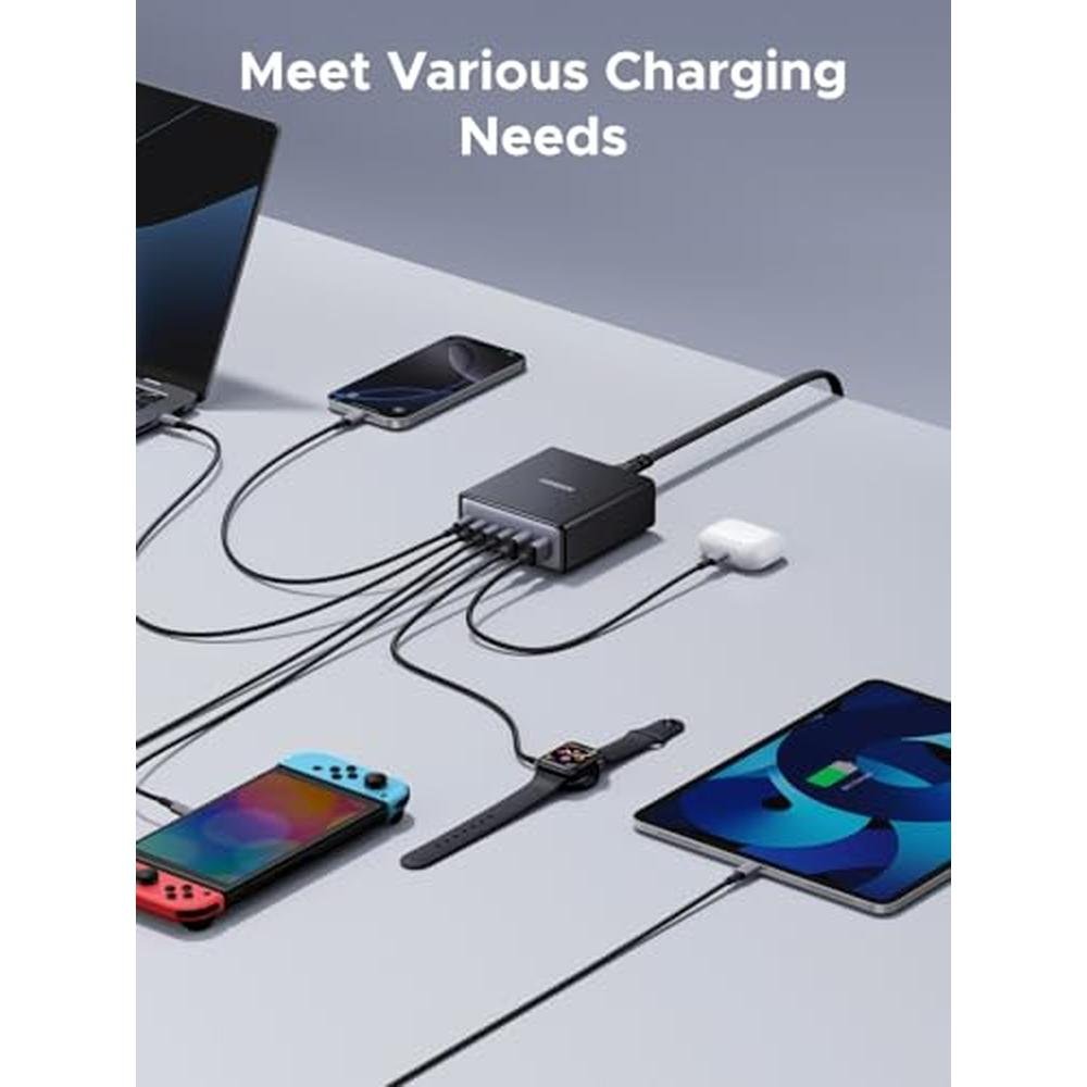 • Equipped with 6 high-speed charging ports, including 4 USB-C and 2 USB-A, to cater to a diverse range of devices, such as MacBook Pro/Air, Dell XPS, iPad, iPhone, Galaxy S, and Pixel smartphones.