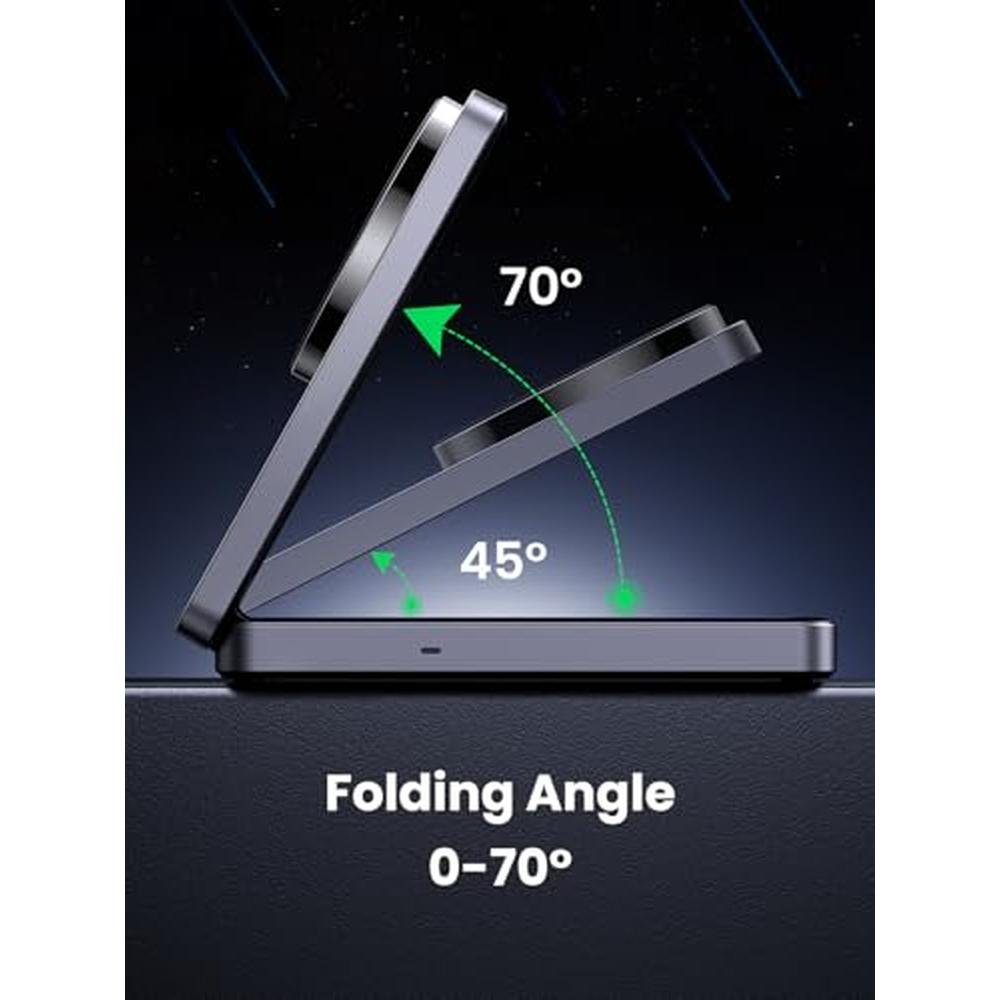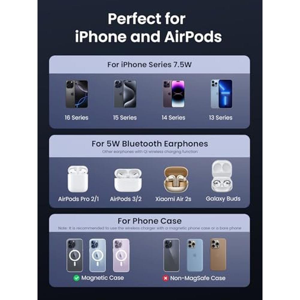 Elevate your iPhone charging experience with the UGREEN MagFlow MagSafe Charger, a 2-in-1 Qi wireless charger stand designed for seamless compatibility with the latest iPhone series. This versatile MagSafe charger stand is also engineered for effortless AirPods charging, ensuring a premium-grade wireless charging experience at home or in the office.