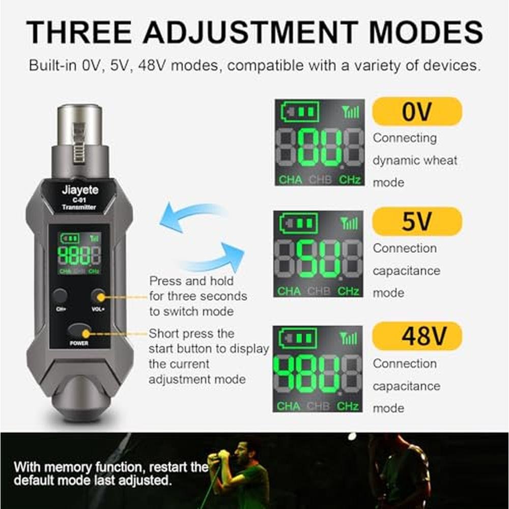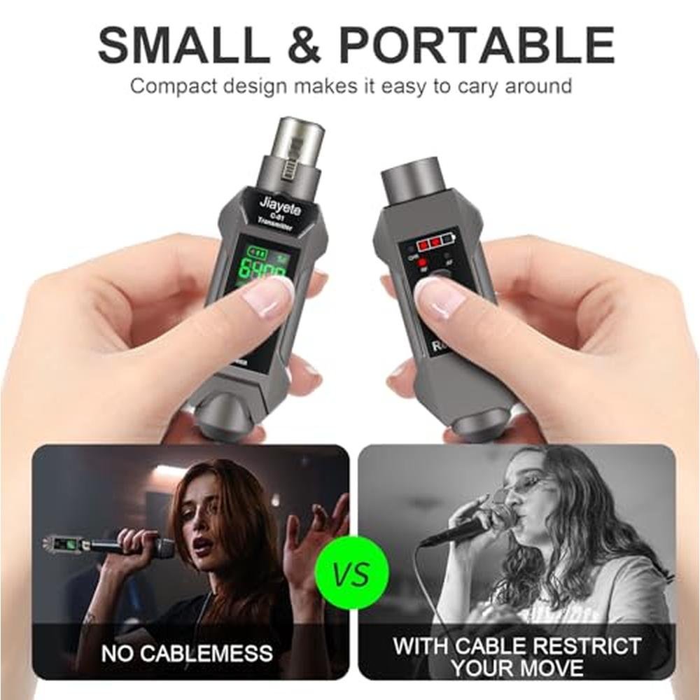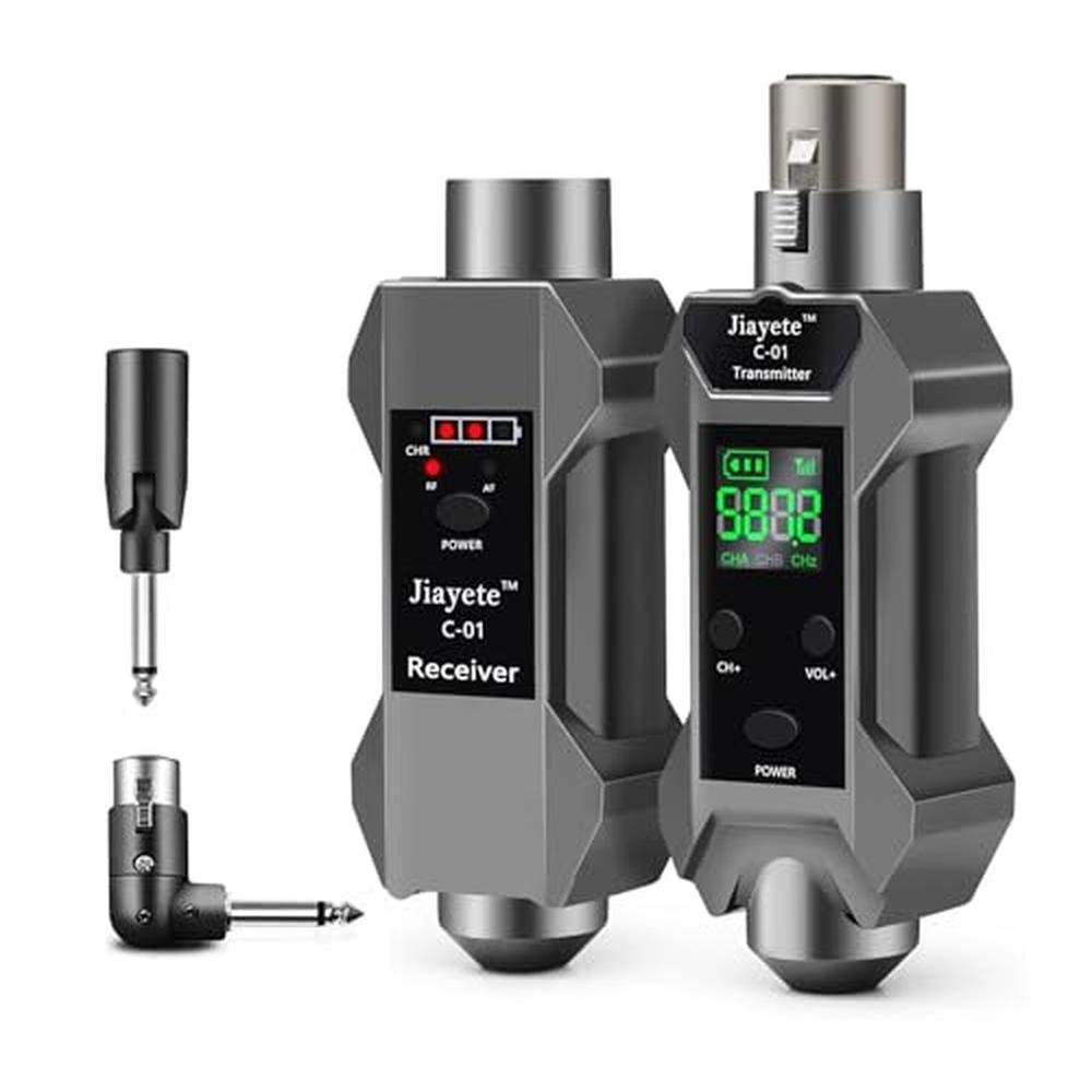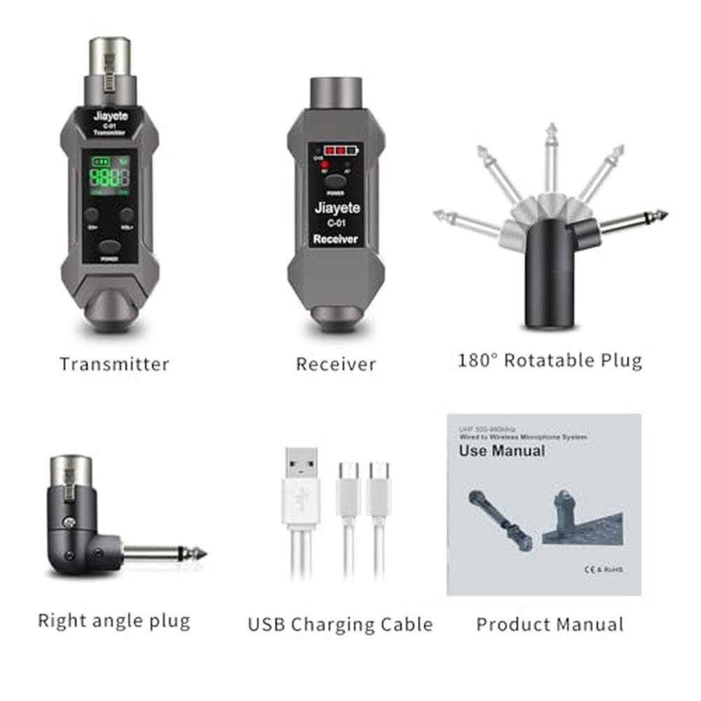 Eliminate cable clutter and expand your freedom of movement on stage with the Jiayete C-01 UHF Wireless Xlr Transmitter and Receiver! Perfect for all XLR interface dynamic microphones and guitar reception, offering a transmitting distance of up to 164ft on the UHF Band. Experience reduced interference from TVs, phones, and routers compared to traditional 2.4GHz and 5.8GHz systems with the C-01 equipment. Featuring 16 channels, you can operate worry-free in areas with high interference or cross-frequency challenges. Get started easily with simple setup and auto IR frequency pairing functionality. Enjoy seamless wireless audio transmission with the Jiayete C-01 system!