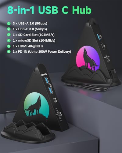 Experience the ultimate in connectivity and productivity with our 8-in-1 Wolf USB C Hub, expertly designed to elevate your workflow. As a premium hub adapter, our product boasts a 4K@30Hz HDMI port, 100W PD, and 5Gbps data transfer speeds through its 3xUSB-A 3.0 ports and 1xUSB-C port. With an integrated SD/TF card reader and vibrant RGB lighting, this sophisticated USB hub adapter is perfect for MacBook, XPS, Surface, iMac, and other high-end devices. Whether you're looking for a reliable hub adapter for best buy, our top-rated product is the ideal solution. Designed for the modern professional, the Wolf USB-C Hub combines functionality with a distinctive design, featuring a unique wolf motif and RGB lighting that adds personality to any upscale workspace. By consolidating all essential ports into one device, you can charge, transfer data, and connect displays without the hassle of switching cables, thereby streamlining your workflow and enhancing your overall productivity.