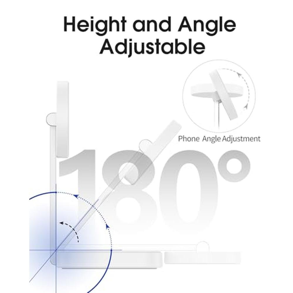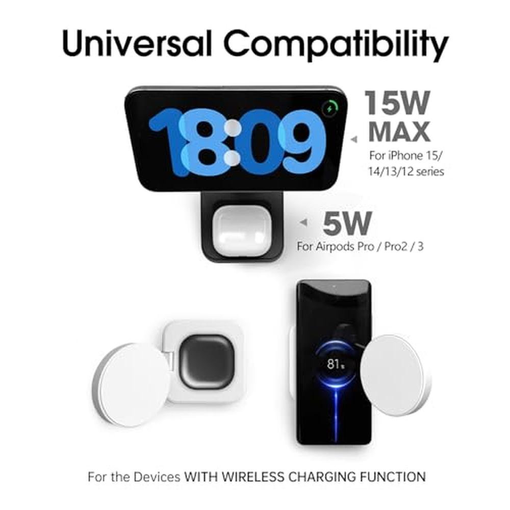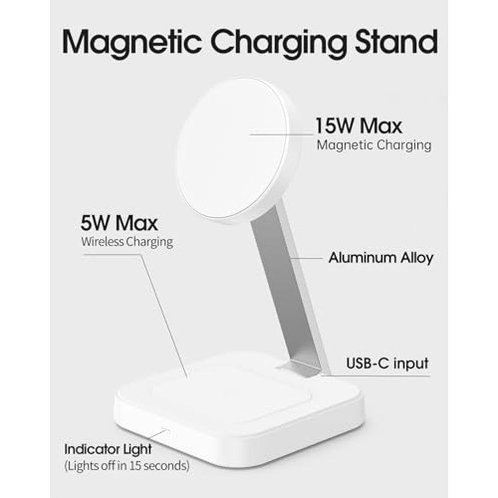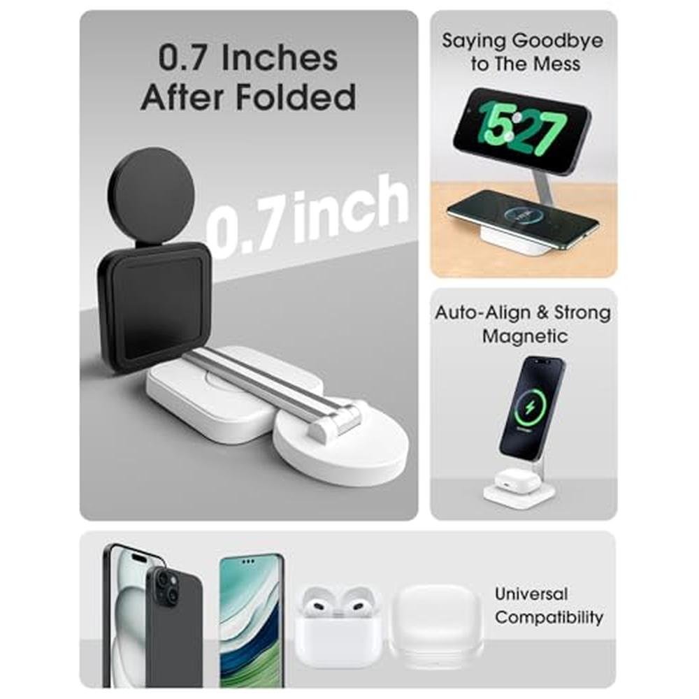 15W Foldable Mag-Safe Fast ChargerThe foldable and compact design allows your phone and earbuds to be magnetically charged simultaneously. The powerful magnet ensures your phone automatically aligns to the charger in the optimal position. Provides extra fast wireless charging from 0% to 100% in 2-3 hours. Not Just a Charger, Also a Phone StandA sturdy aluminum rod provides a stable and reliable holding function. The height and angle can be adjusted while charging. The overall thickness is less than one inch after folding, making it very convenient to carry. Widely Compatible MagSafe Charging StationCompatible with iPhone 12-16 series, AirPods Pro/4/3/2 (wireless charging case), and other mobile phones that support wireless charging. Safer Intelligent ProtectionBuilt-in safeguards protect your devices from overcharging, overcurrent, and overheating for added peace of mind. The LED light on the magnetic charger will flash and stop charging when a problem is detected. Tips Adapter not included. Please use a power adapter of 18W or higher. Regular cases will weaken the magnetic connection. Please use a MagSafe case. The LED indicator will turn off automatically after 15 seconds, ensuring it won't disturb your sleep at night. What You GetWireless charger *1, USB-A to USB-C fast charging cable(3..