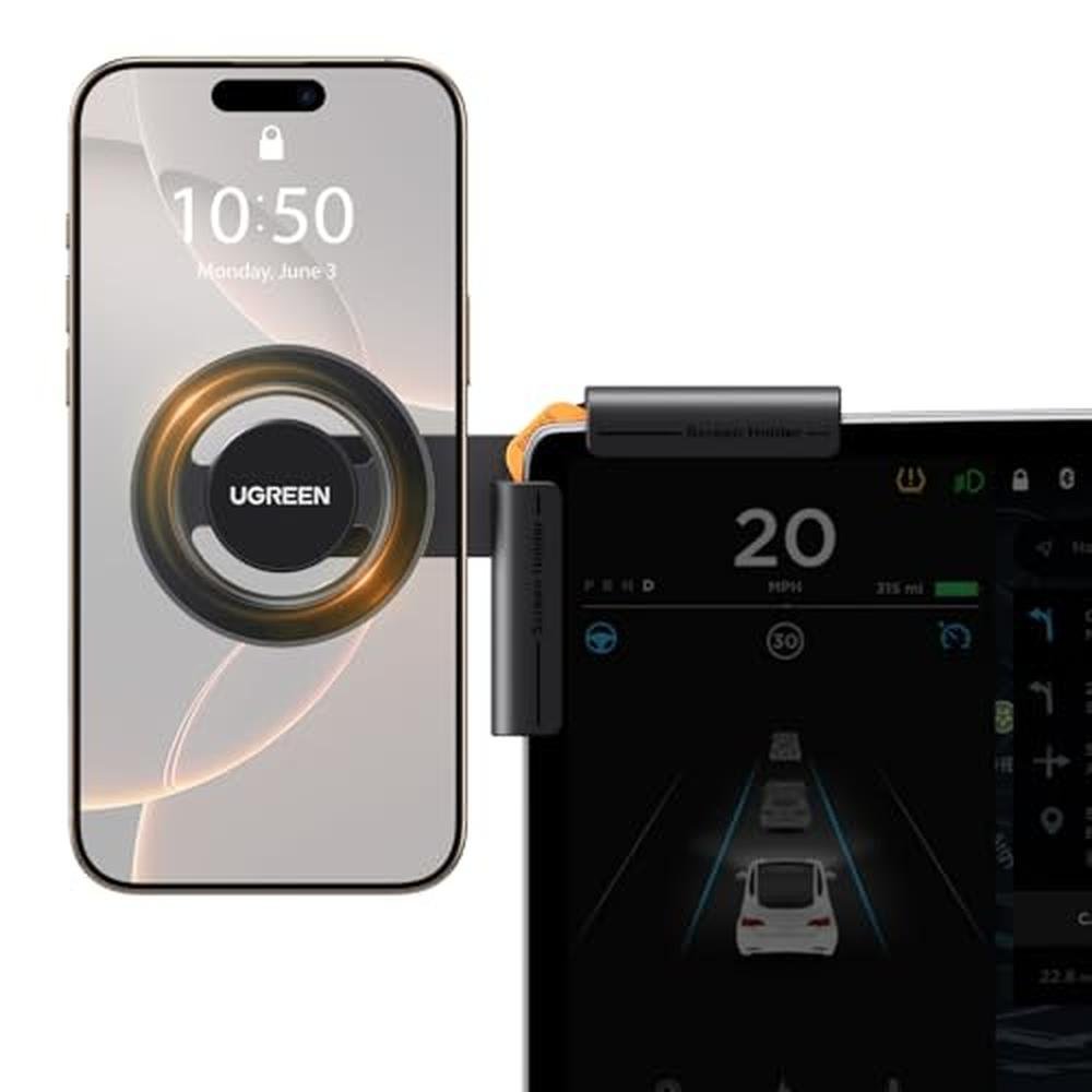 UGREEN Tesla Phone Mount The Smarter Way to Drive Designed specifically for Tesla Model 3/Y, the UGREEN Magnetic Phone Mount offers the perfect blend of security, convenience, and premium design. Its hassle-free installation fits seamlessly behind your Teslas touchscreen, while the one -click lock ensures a rock-solid holdno wobbling, no slipping. With 20 ultra-strong magnets, your phone stays firmly attached even on rough roads, yet remains easy to snap on and off with one hand. The advanced triangular support structure and anti-slip silicone padding keep the mount securely in place without scratching your screen. Enjoy full freedom of adjustment with the 360 rotating ball joint and multi-angle arm, allowing you to position your phone perfectly for navigation, calls, or mediaall while maintaining uninterrupted signal strength. MagSafe-compatible with iPhone 12-17 series. Drive smarter. Stay connected. Go UGREEN.