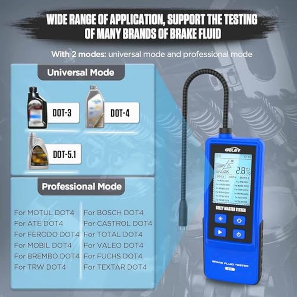 BELEY Automotive Brake Fluid Tester,Car Digital Brake Fluid Boiling Point Meter for DOT3 DOT4 DOT5.1 with 2.8 Inch LCD Screen & High Precision Probe Use Scenario: auto repair stores, auto tuning factories, auto 4S after-sales service centers, your own garage, DIY auto enthusiasts. Use purpose: detect the quality of automobile brake fluid, whether the brake fluid needs to be replaced, to ensure that the lubrication of automobile brake pads function properly. The Best Father's Day Gifts for Auto Mechanics. Father's Day Gifts. Arrives before Father's Day.