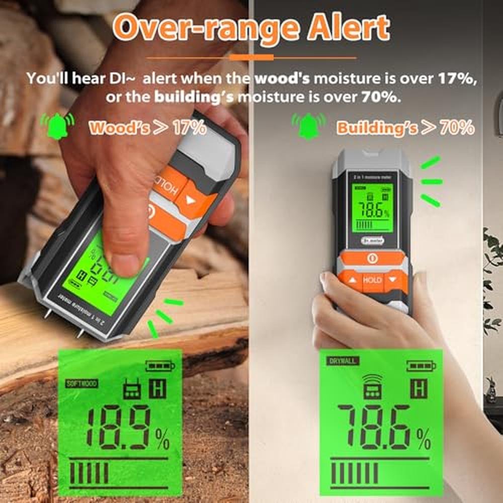 - Over-range Alert: There are four pinless scanning modes of softwood, hardwood, masonry and drywall. The general algorithm has been written into the user manual to reduce the redundant settings before use to facilitate customers. When the wood moisture exceeds 17% or the wall humidity exceeds 70%, the wood moisture tester will beep to alert you.