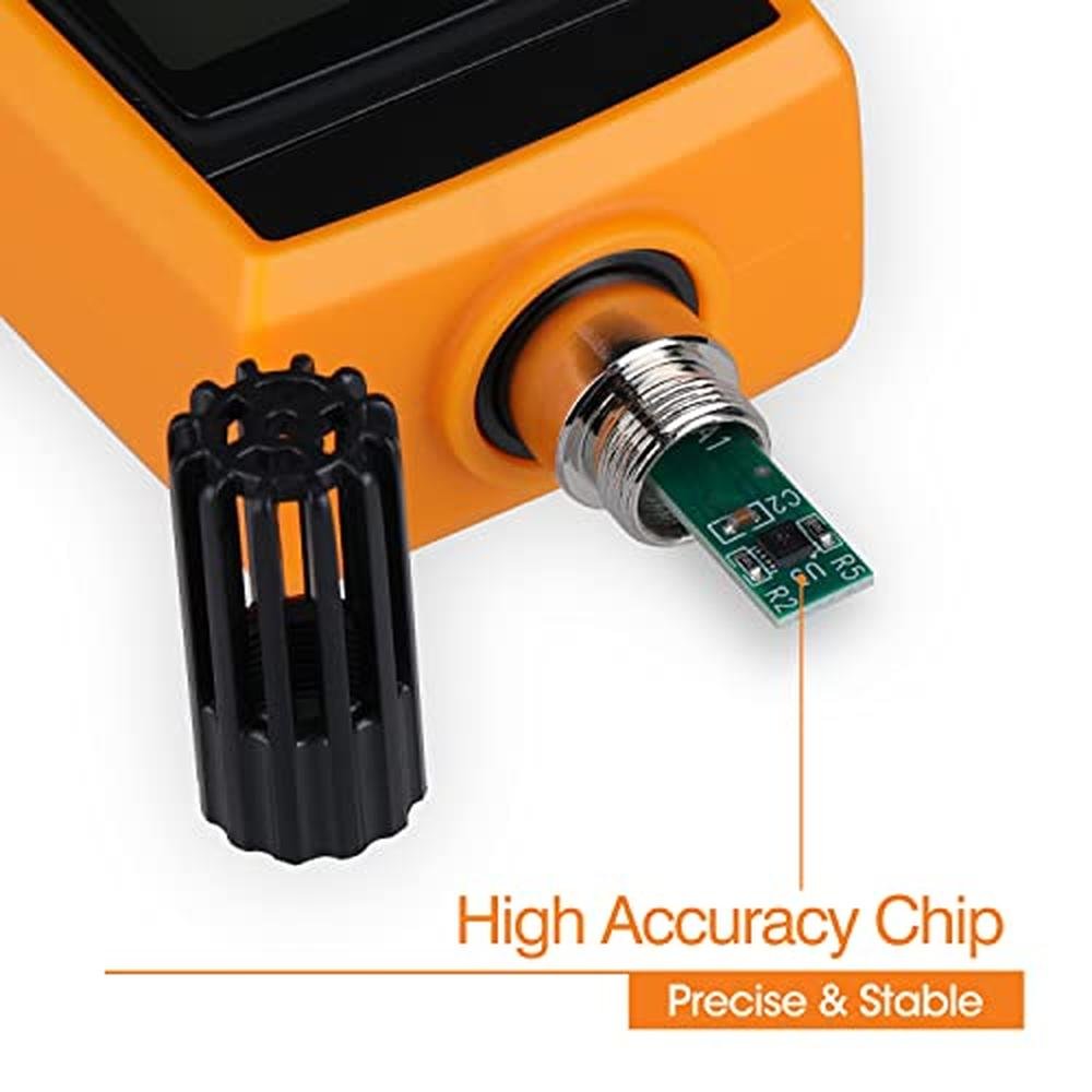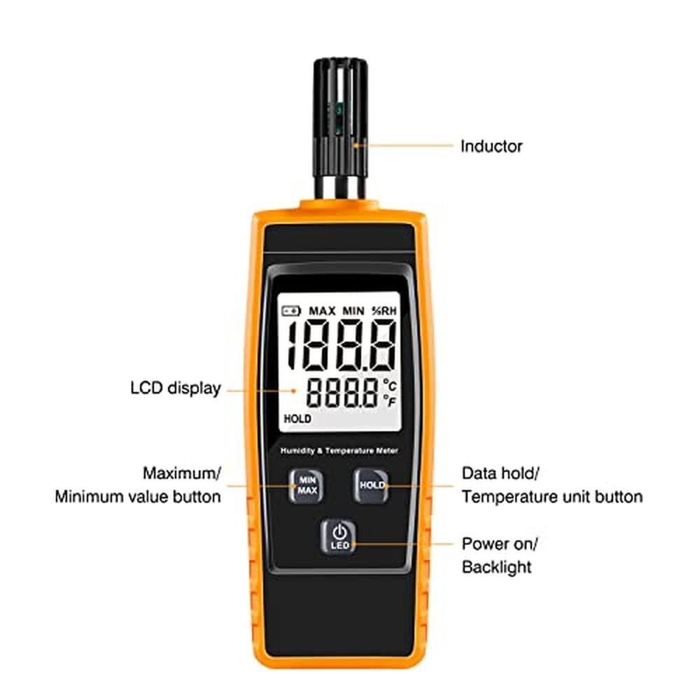 - WIDE APPLICATIONSThe handheld humidity meter can measure a wide range of temperature and humidity at same time, used for HVAC, industry, agriculture, meteorology, medical, daily life, building engineer, paranormal investigator, machine room, greenhouse, warehouse, data storeroom and etc.