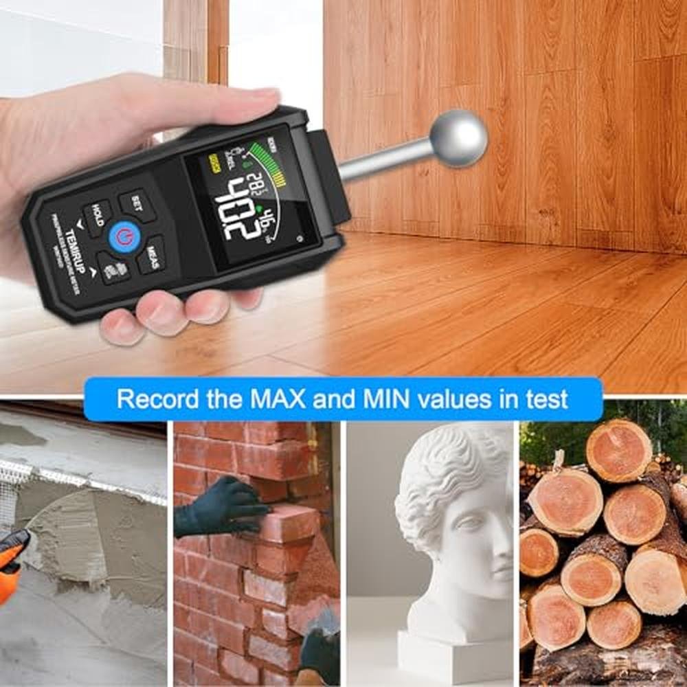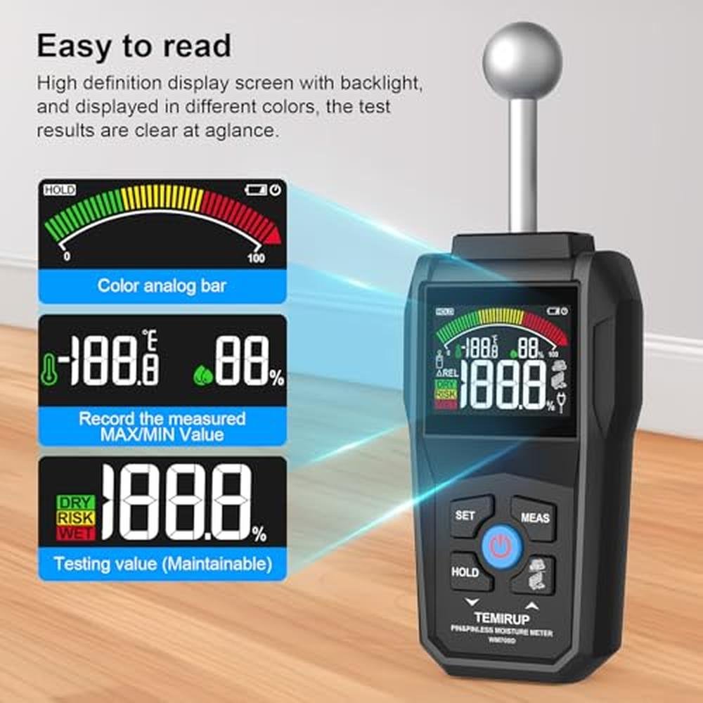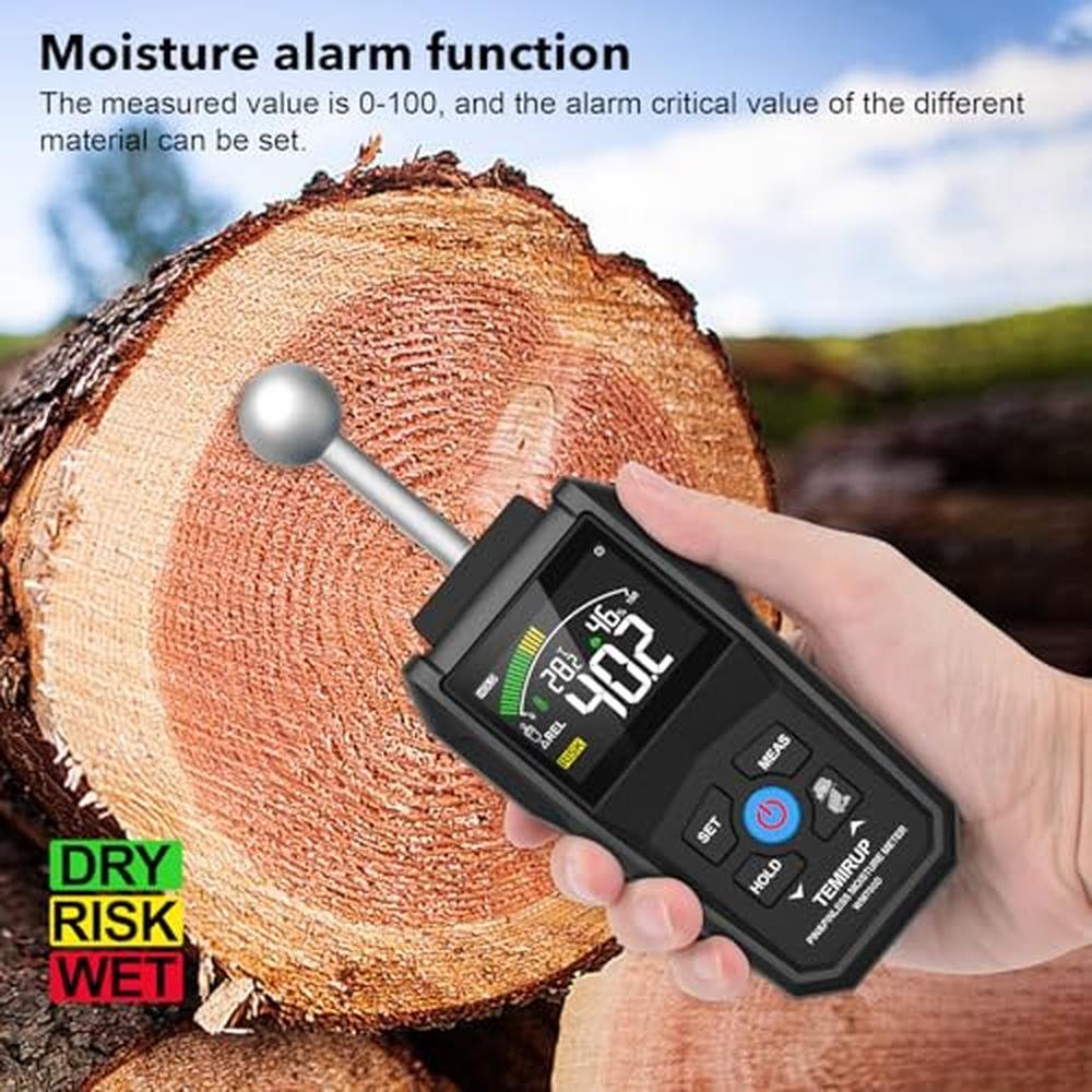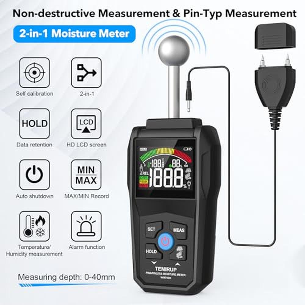 Moisture Meter - TEMIRUP Pin & Pinless Wood Moisture Tester with Color LCD and Acoustic Alarm, Digital Moisture Reader Detects 20-40 mm for Walls, Wood, Masonry, Concrete and Other Building Materials