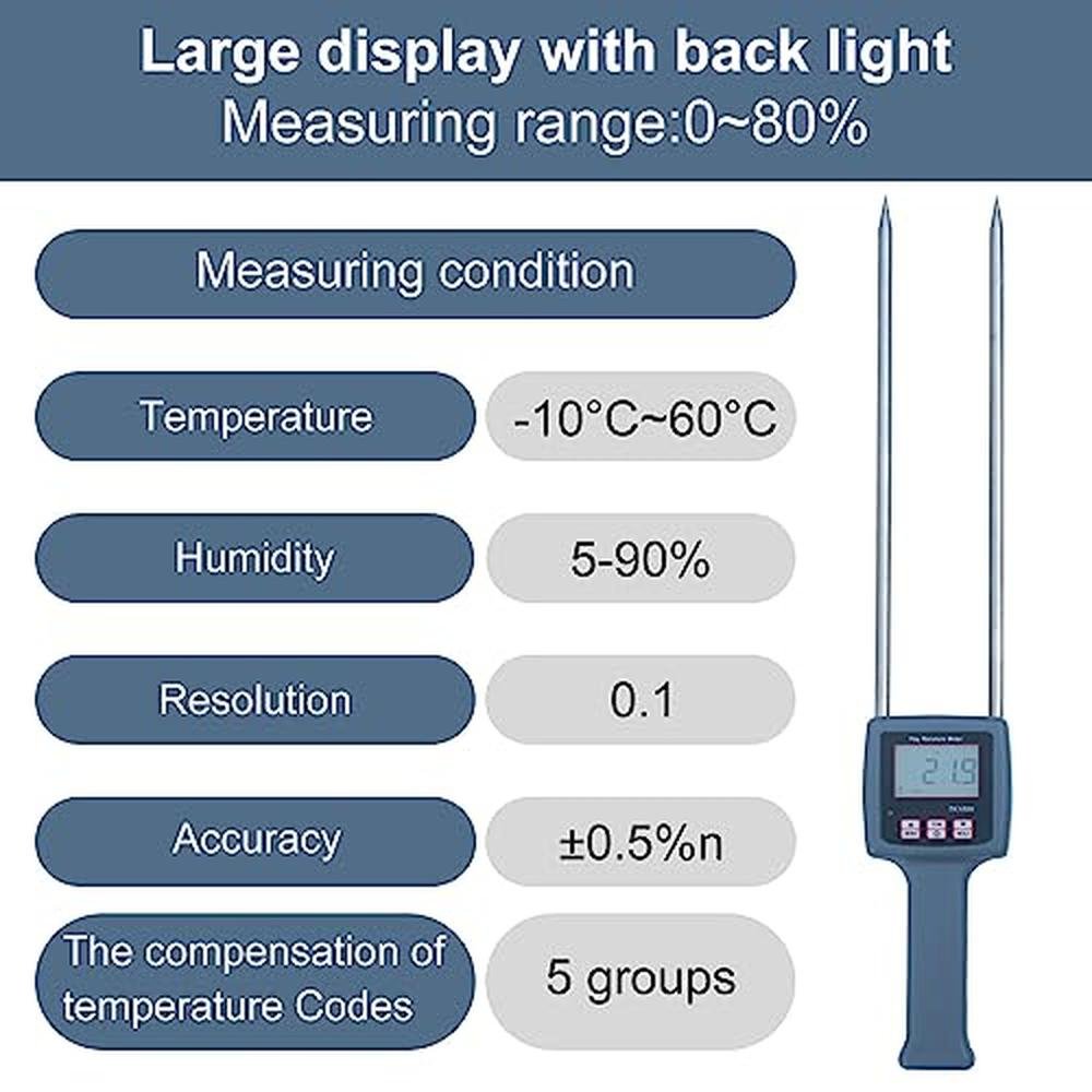• Accurate Digital Display: The digital display of our hay moisture meter features a backlit screen, ensuring that you can easily read and obtain precise moisture readings, even in low-light or somber conditions.