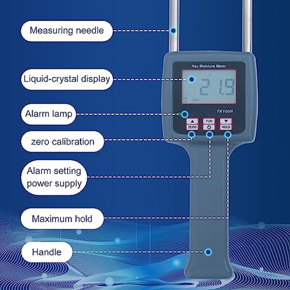 • Reliable Hay Moisture Testing: Designed specifically for testing hay moisture levels, our hay moisture meter, also referred to as a hay moisture tester or hay moisture tester probe, provides accurate readings to help you determine optimal hay quality.