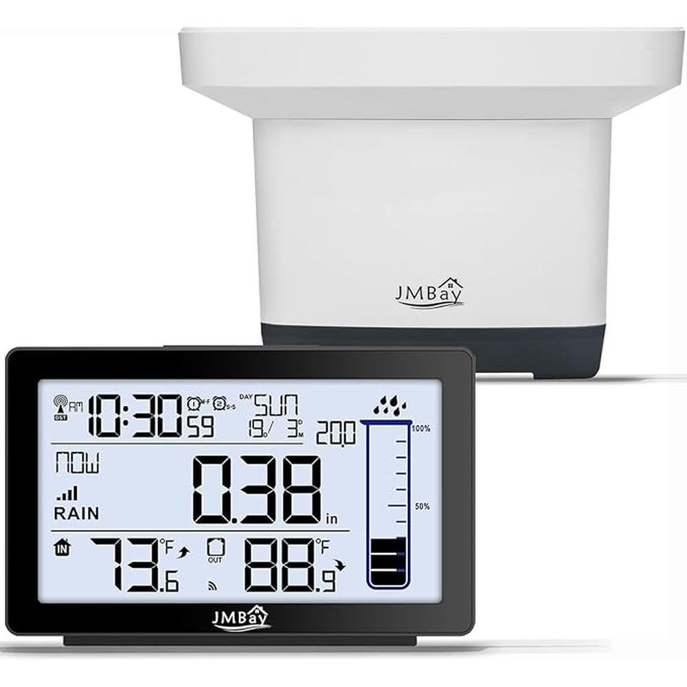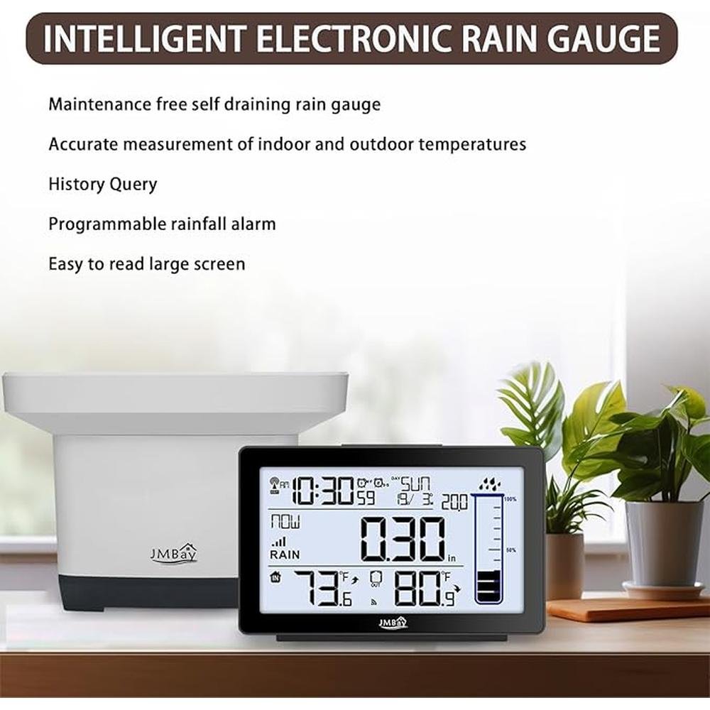 - Multi Function Rain Gauge -- The wireless digital rain gauge not only monitors rainfall, but also provides real-time indoor and outdoor temperatures, WWVB Radio control time function. Additionally, rain water meter features a practical dual alarm clock with snooze function and calendar for everyday use. With its functional yet stylish design, the JMBay rain gauge weather station is the perfect decorative addition to your living room, bedroom, office, greenhouse, tent, and more.