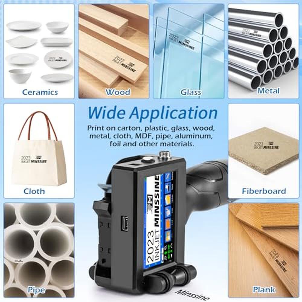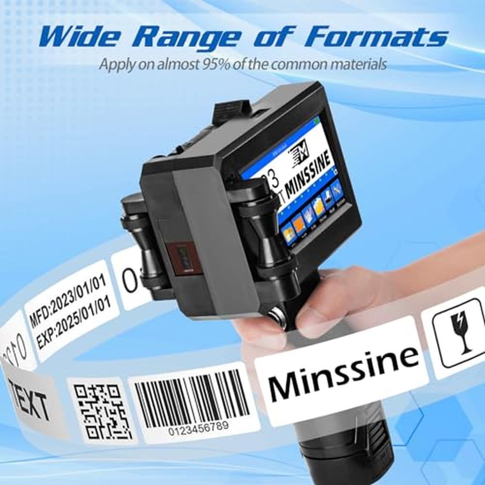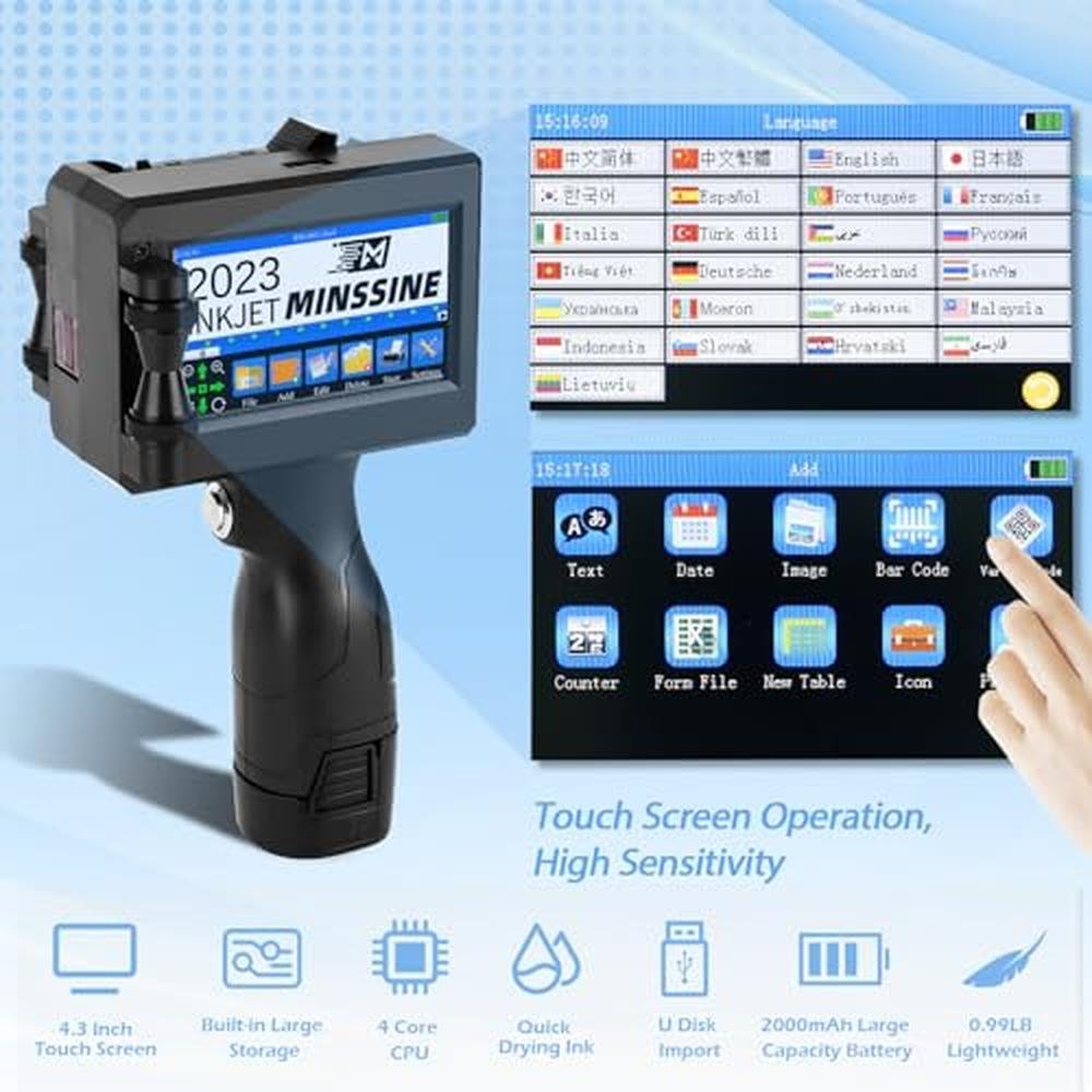 Experience the ultimate in portable printing with the MS-Z10 Handheld Inkjet Printer, a top-tier handheld printer solution designed for efficient text, barcode, logo, QR code, counter, batch number, and date coding on various surfaces. With its 42ml quick-drying ink cartridge, this premium handheld printer for any surface ensures high-quality prints with a printing height of 0.08-0.5 inches. Ideal for use on clothes, labels, and other materials, the MS-Z10 is a prime choice among handheld printer reviews for its reliability, ease of use, and affordability. Elevate your printing game with the MS-Z10, equipped with a 42ml black quick-drying ink cartridge that ensures your prints dry rapidly, delivering clear and sharp results. Unlock versatility like never before with customizable printing options, whether you're printing on carton boxes, metal boards, wood, glass, or curved surfaces. The MS-Z10 adapts to your needs with printing heights ranging from 0.078 inches to 0.5 inches and support for 1 to 5 lines of text. Achieve high-resolution performance with 300, 400, and 600 DPI, ensuring every detail is captured with precision. Immerse yourself in diverse content printing with the MS-Z10, catering to various industries including warehousing, retail, logistics, and DIY workshops. This handheld printer supports text, QR codes, barcodes, dates, and logos in BMP, JPG, and PNG formats, plus multi-language support means you can customize prints in English, Spanish, Japanese, and more. Designed with portability and user-friendliness in mind, the MS-Z10 features a 4.3-inch touch screen and a compact, lightweight design, making on-the-go printing effortless. Each package comes complete with essential accessories and is elegantly packed in a suitcase, ensuring everything you need is at your fingertips. Choose the MS-Z10 Handheld Inkjet Printer for its versatility, portability, and superior printing capabilities. Backed by Minssine's 12-hour response technical support, you can purchase with confidence knowing you're supported every step of the way. Transform your printing experience today with the MS-Z10, a refined and sophisticated handheld printer solution that redefines the printing experience.