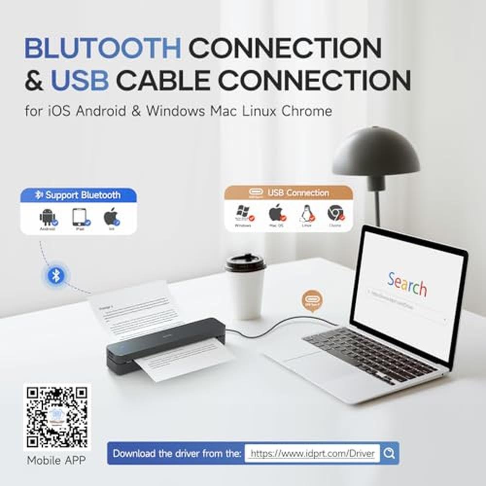 Experience the pinnacle of portable printing with the iDPRT Portable Printer, a premium wireless device engineered for seamless travel, home, office, and vehicle use. This sophisticated mobile Bluetooth printer boasts high-resolution 300DPI inkless thermal printing technology, supporting an extensive range of paper sizes, including 8.5" x 11" US Letter. Compatible with both smartphones and PCs, the iDPRT printer offers effortless connectivity and printing on-the-go. Whether you require a reliable printer for everyday use or a convenient solution for mobile printing, the iDPRT printer is the ultimate choice. For effortless setup and use, visit our website to download the iDPRT printer drivers, app, and software, or follow our simple setup guide.
