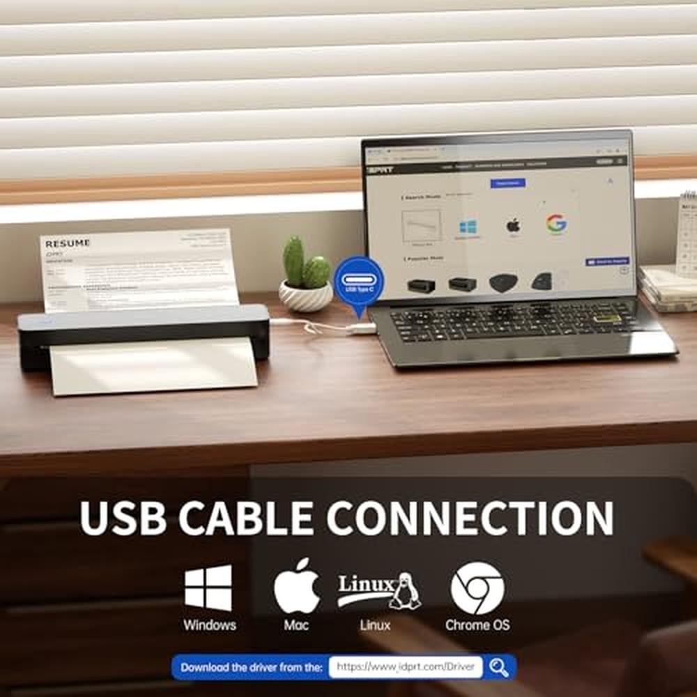 The idprt mt610 portable thermal printer can connect seamlessly via Bluetooth or USB, compatible with iOS/Android phones and laptops (Mac, Windows, Linux, and Chrome OS). The wireless portable printer has a built-in 2000 mAh rechargeable battery, and can print up to 240 pages per charge. To print from your smartphone, simply download the "HerePrint" app from Google Play/App Store, press and hold the travel printer power for 2 seconds to start the printer, turn on the phone Bluetooth, and find the printer through the "+" button of the app to pair. Finally, select your file and print.