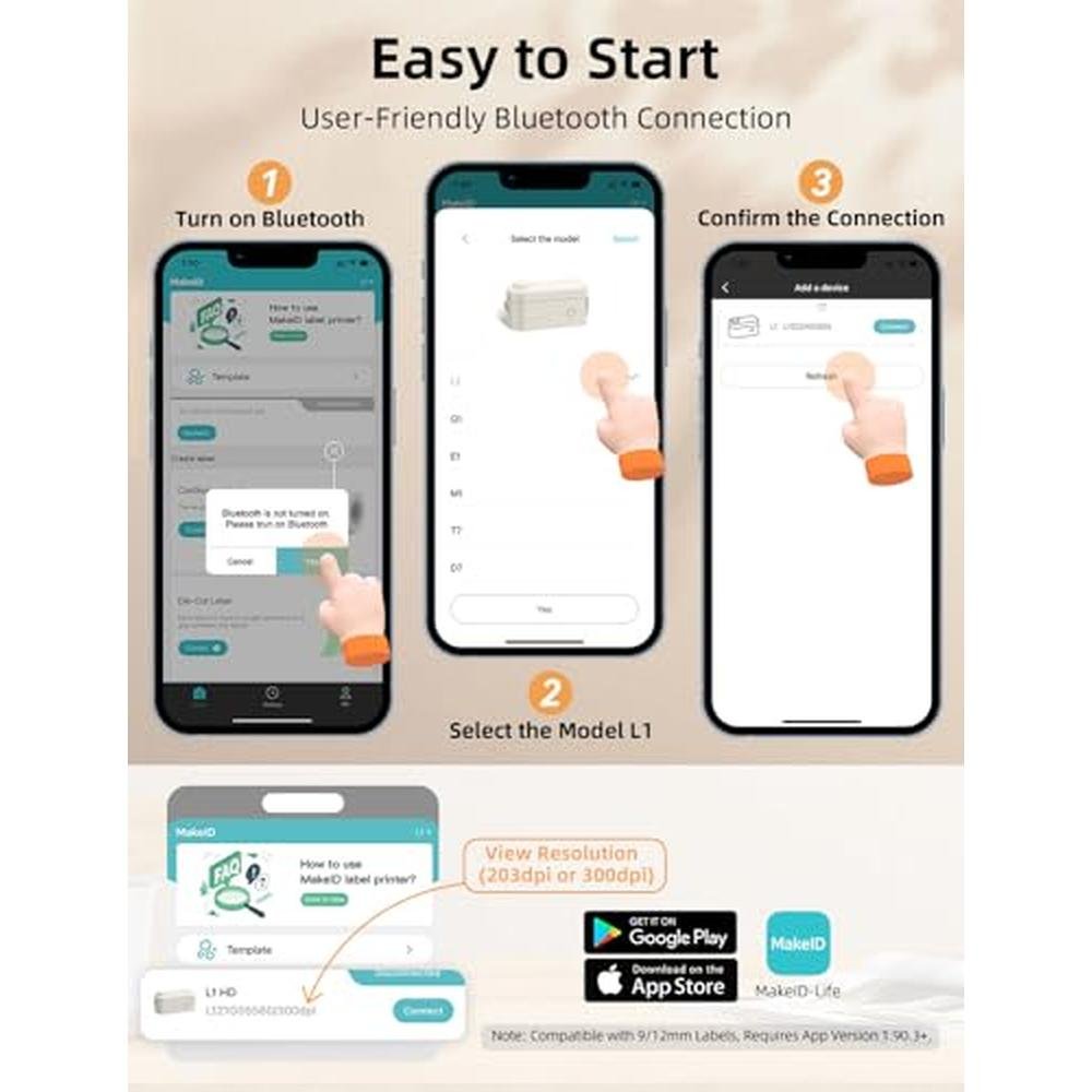 The MakeID Modern Bluetooth Label Printer L1 featuring wireless technology allows you to easily design and print durable, water-resistant, self-stick labels up to 16 mm wide from your iOS or Android smartphone via the free MakeID-Life App. Instead of a clunky keyboard, your cell phone screen and the MakeID-Life APP provide a better interface for perfect, professional, and dedicated label creation every time. Choose from pre-made creative templates to highlight your products or create your own unique designs for home, home office, crafting, and small business. Enjoy smartphone features such as spell check and voice to text to simplify label creation. The sleek, mini design makes the MakeID L1 Labeler a great choice for retail store, crafting business, office and home on a budget.
