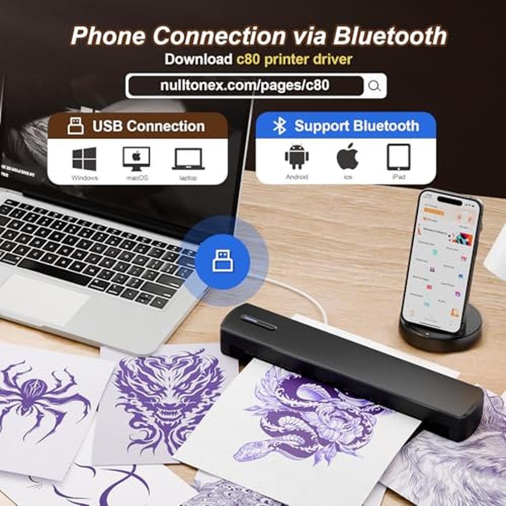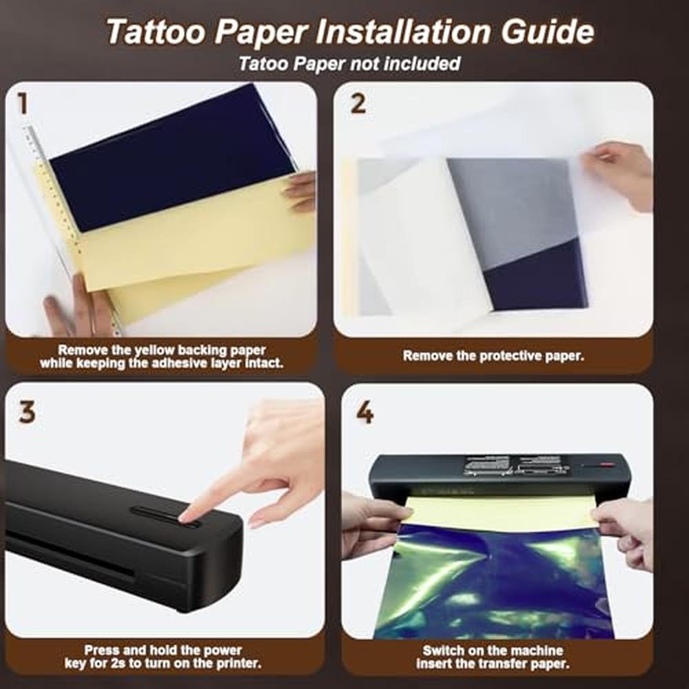 Experience the ultimate in tattoo art creation with our premium Tattoo Stencil Portable Thermal Printer, expertly designed to streamline the process of creating and transferring tattoo stencils with unparalleled ease. This advanced wireless tattoo stencil printer boasts compatibility with a wide range of paper sizes, including 8.5 x 11, Letter, A4, and A5, rendering it an indispensable tool for professional tattoo artists, business trips, travel, home offices, and beyond. Seamlessly connect and transfer intricate tattoo stencil designs via Bluetooth from laptops, smartphones, and PCs, unlocking a world of creative possibilities. Whether you're a seasoned tattoo artist or an enthusiast, our sophisticated tattoo stencil maker is poised to elevate your artistry to new heights.